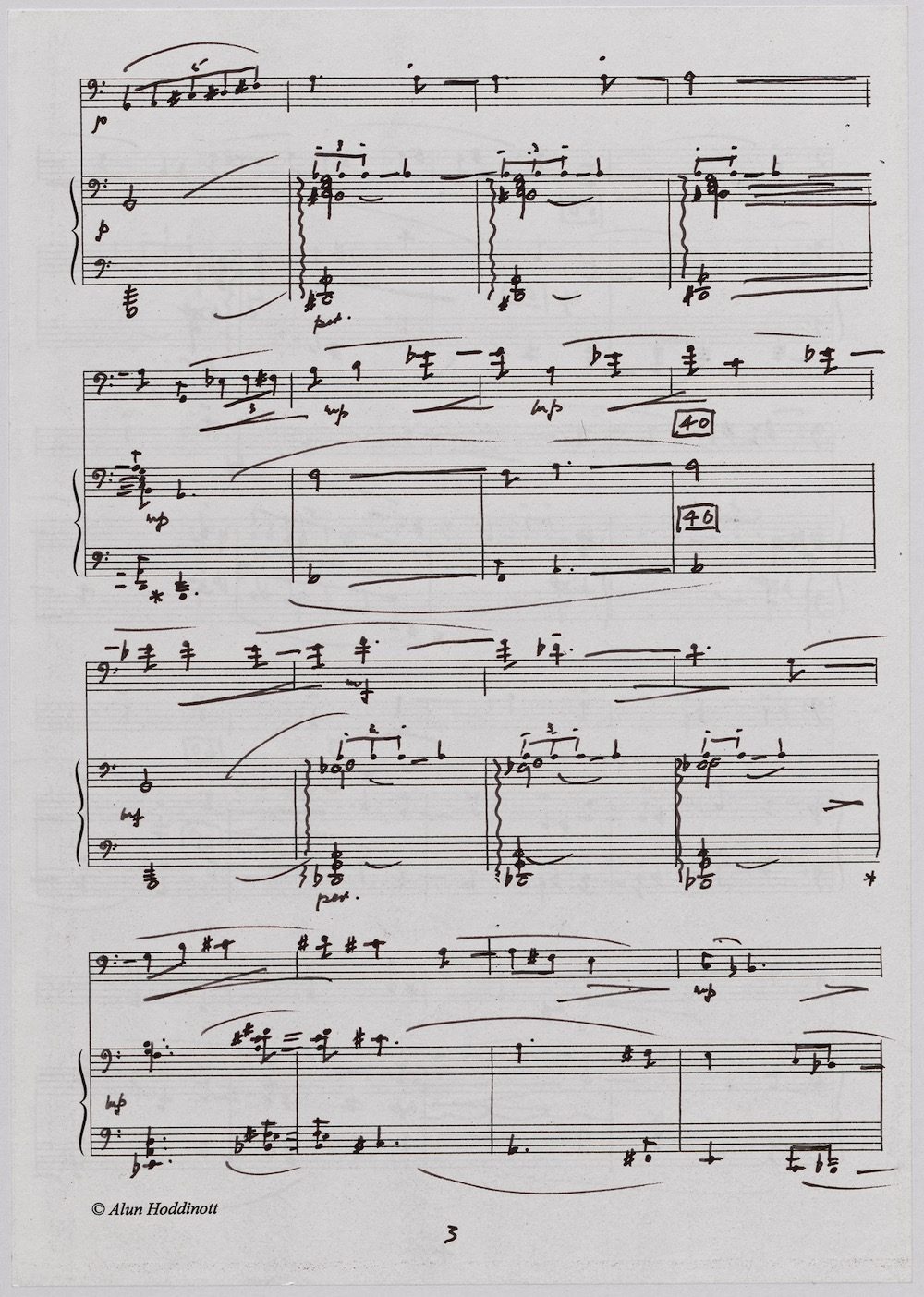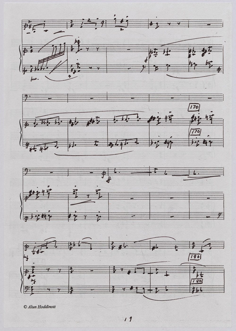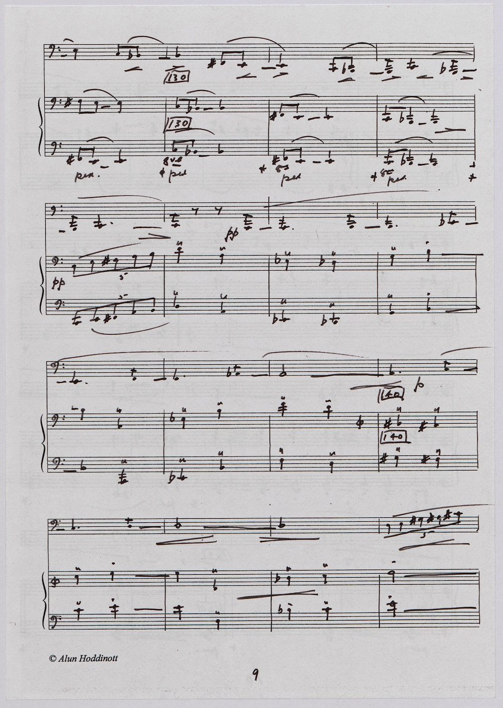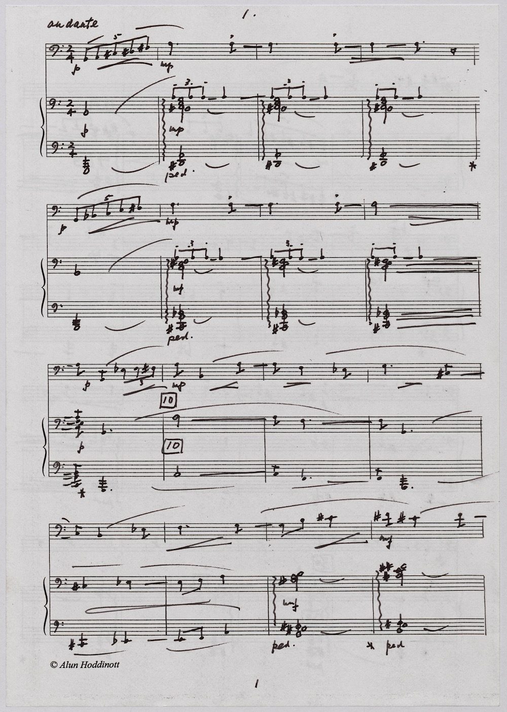 The first of Hoddinott’s three cello sonatas was composed in 1970. In 1967 he became Professor and Head of the Music Department at Cardiff University (his alma mater) where the faculty staff included a resident piano quintet. Hoddinott did much to promote the Ensemble’s wider profile in terms of recordings, broadcasts, festival concerts and performances outside Wales. This Sonata is a fine example – composed for cellist George Isaac and pianist Eric Harrison to play at London’s Wigmore Hall on May 15th, 1970, with an Argo (Decca) recording to follow (not currently available or transferred to cd). In two connected movements lasting some 15 minutes, a brooding Andante leads via an unaccompanied cadenza into a lively Allegro molto which transforms much of the material already heard. The screen shows the composer’s final manuscript score, which was published by OUP in 1970.The two subsequent sonatas were composed in 1977 (op.96 No.1) and 1996 (op.159) respectively.