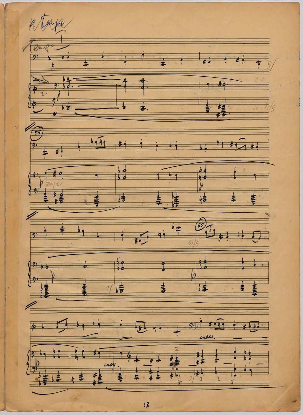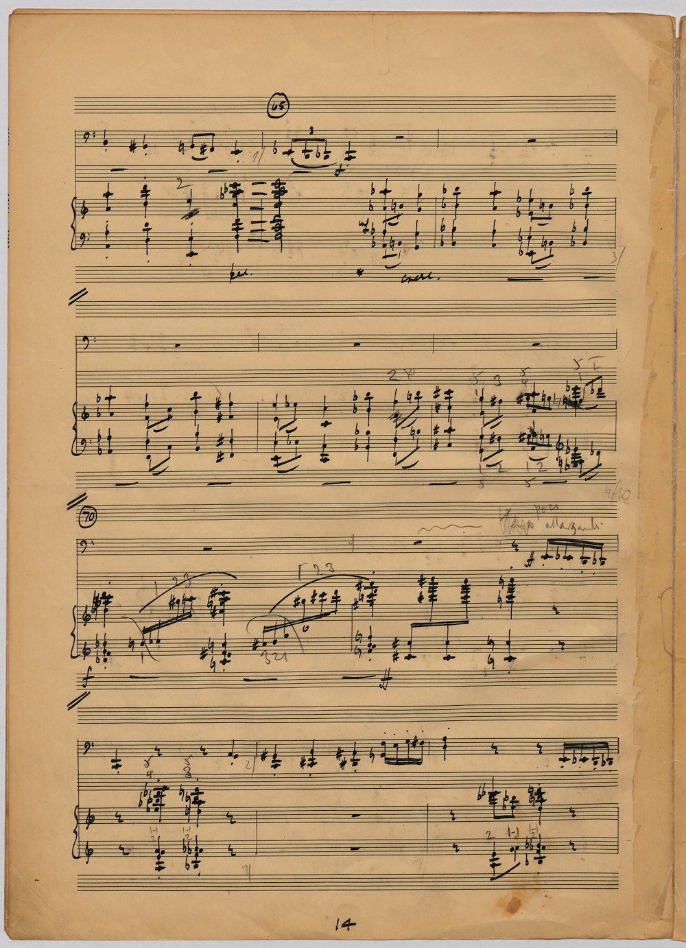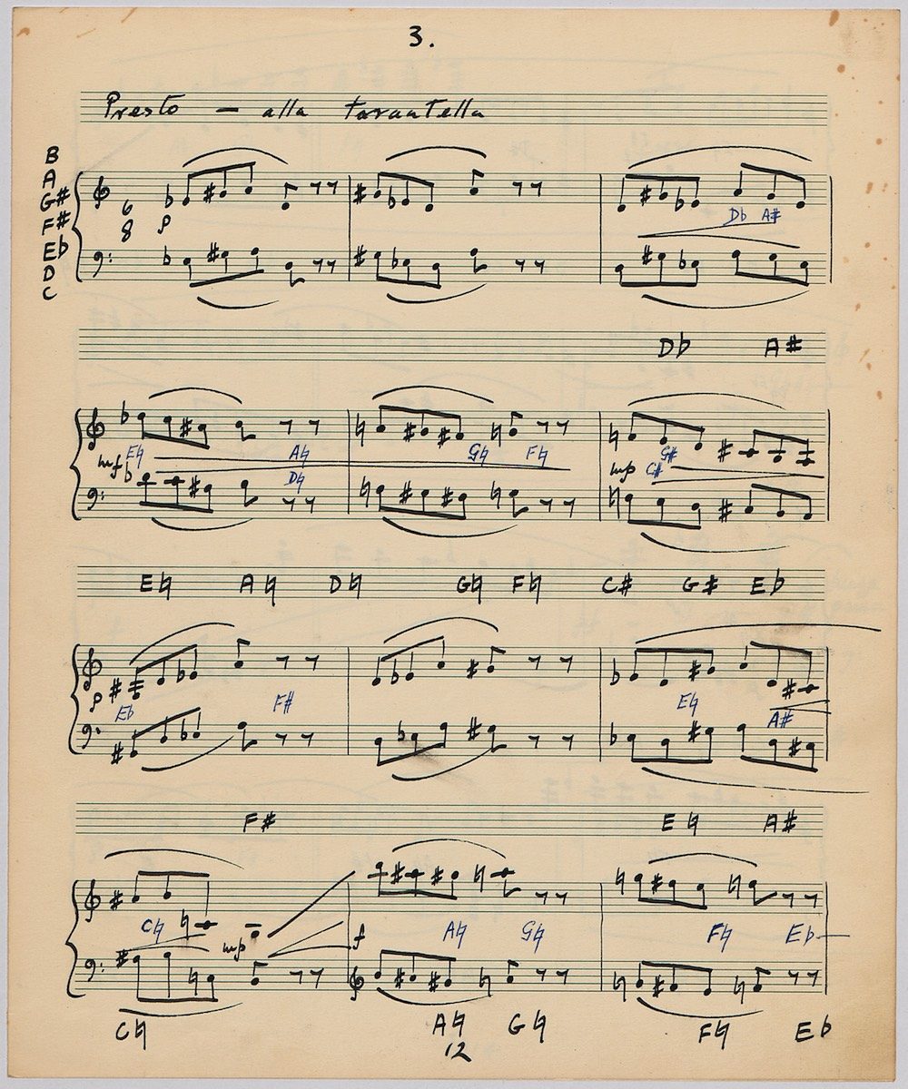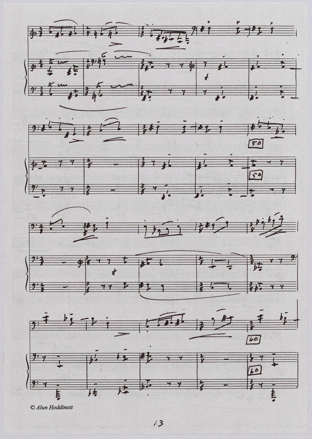 The first of Hoddinott’s three cello sonatas was composed in 1970. In 1967 he became Professor and Head of the Music Department at Cardiff University (his alma mater) where the faculty staff included a resident piano quintet. Hoddinott did much to promote the Ensemble’s wider profile in terms of recordings, broadcasts, festival concerts and performances outside Wales. This Sonata is a fine example – composed for cellist George Isaac and pianist Eric Harrison to play at London’s Wigmore Hall on May 15th, 1970, with an Argo (Decca) recording to follow (not currently available or transferred to cd). In two connected movements lasting some 15 minutes, a brooding Andante leads via an unaccompanied cadenza into a lively Allegro molto which transforms much of the material already heard. The screen shows the composer’s final manuscript score, which was published by OUP in 1970.The two subsequent sonatas were composed in 1977 (op.96 No.1) and 1996 (op.159) respectively.