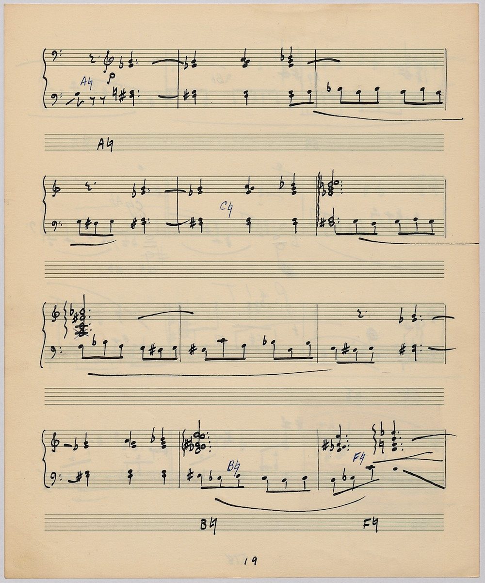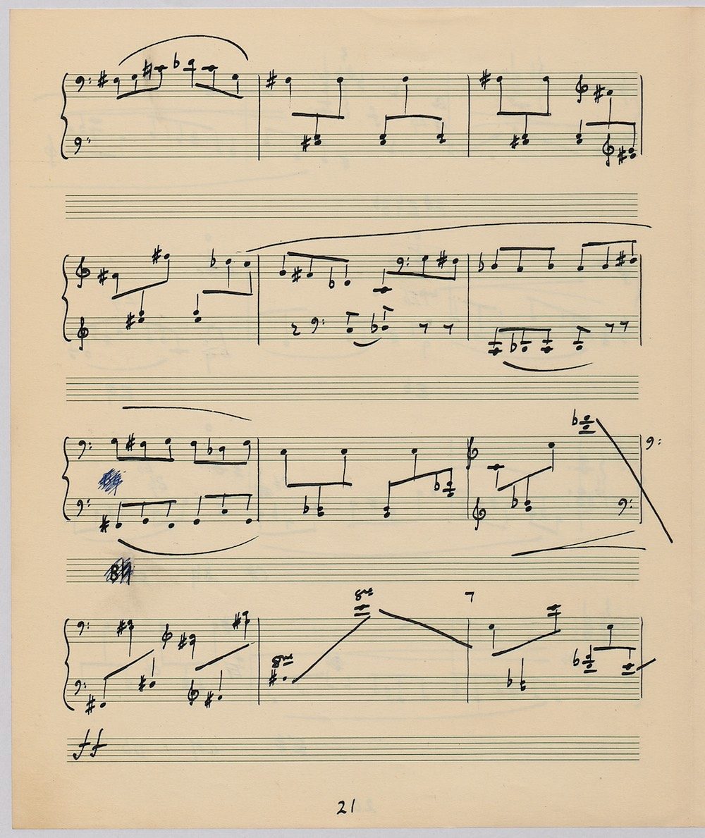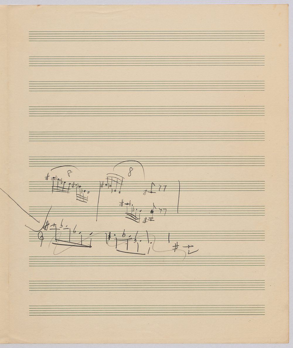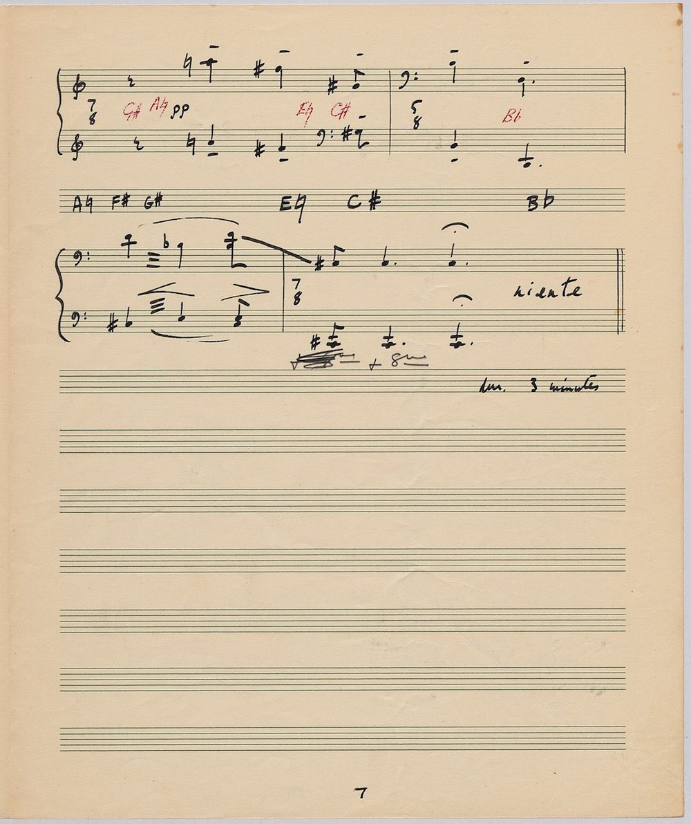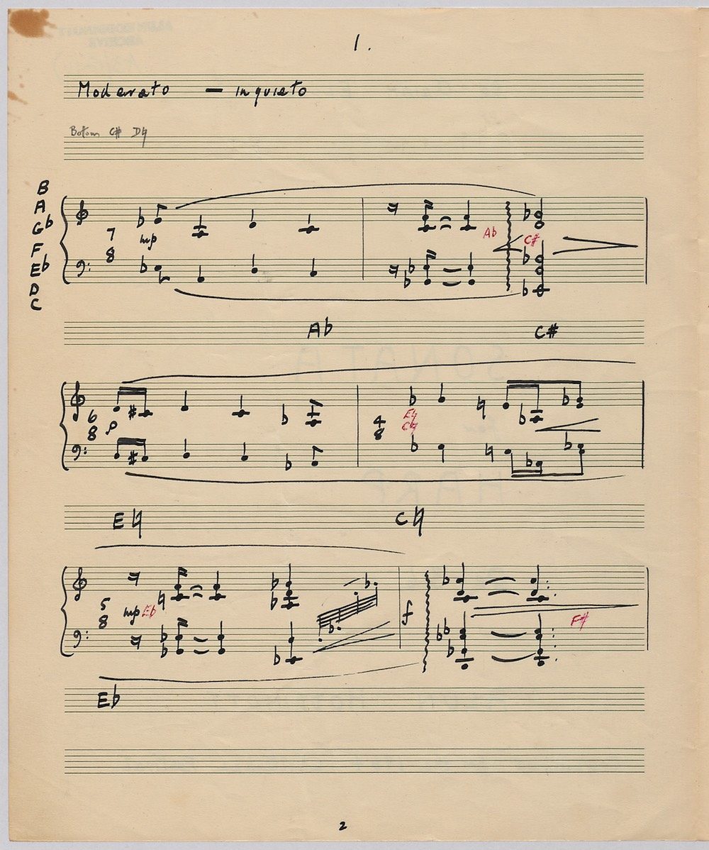 Hoddinott’s first piece for the brilliant harpist Osian Ellis was a short solo Impromptu which he played at Cardiff Music Club on October 25th, 1956 but which the composer subsequently withdrew. The Harp Concerto, Op.11 followed in 1957 to a commission by Ellis who gave the premiere at the 1958 Cheltenham Festival where the composer conducted the Halle Orchestra. Hoddinott had first been to the Cheltenham Festival as a student shortly after its formation in 1945 and from 1954 onwards developed a close association with the event. The Piano Sonata No.1 was commissioned in 1959 and Symphony No.2 in 1962. The Harp Sonata followed in 1964, was premiered on July 12th in the Town Hall and has three contrasted movements lasting in total some 12 minutes. The screen shows the composer’s final ‘neat’ score together with some editing notes by Osian Ellis for the publication by OUP in 1967, and one page with a notational sketch. There is no recording of this Sonata to date. The composer’s other solo harp works are a Suite, Op.52 (1967) a Fantasy, Op.68 No.2 (1970) and a Second Sonata: Tempi, Op.164 (1997) which Catrin Finch has recorded on Sain SCD2484
