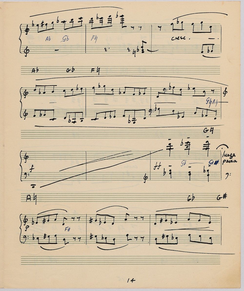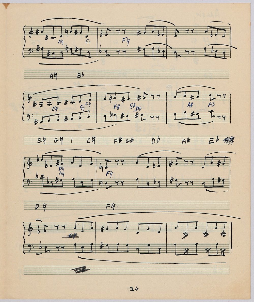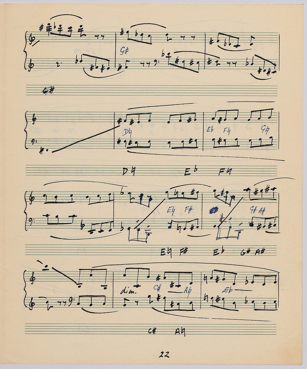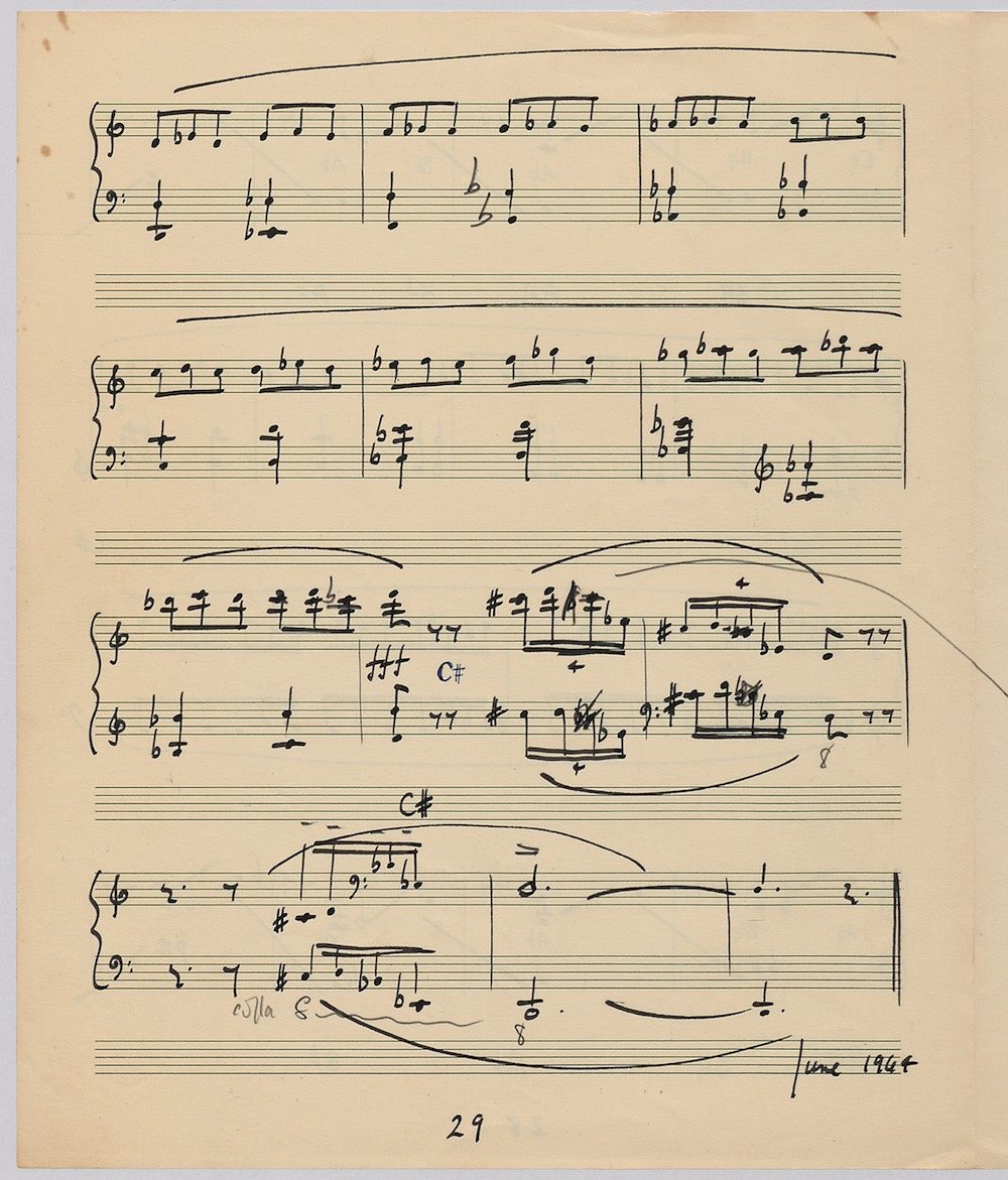 Hoddinott’s first piece for the brilliant harpist Osian Ellis was a short solo Impromptu which he played at Cardiff Music Club on October 25th, 1956 but which the composer subsequently withdrew. The Harp Concerto, Op.11 followed in 1957 to a commission by Ellis who gave the premiere at the 1958 Cheltenham Festival where the composer conducted the Halle Orchestra. Hoddinott had first been to the Cheltenham Festival as a student shortly after its formation in 1945 and from 1954 onwards developed a close association with the event. The Piano Sonata No.1 was commissioned in 1959 and Symphony No.2 in 1962. The Harp Sonata followed in 1964, was premiered on July 12th in the Town Hall and has three contrasted movements lasting in total some 12 minutes. The screen shows the composer’s final ‘neat’ score together with some editing notes by Osian Ellis for the publication by OUP in 1967, and one page with a notational sketch. There is no recording of this Sonata to date. The composer’s other solo harp works are a Suite, Op.52 (1967) a Fantasy, Op.68 No.2 (1970) and a Second Sonata: Tempi, Op.164 (1997) which Catrin Finch has recorded on Sain SCD2484