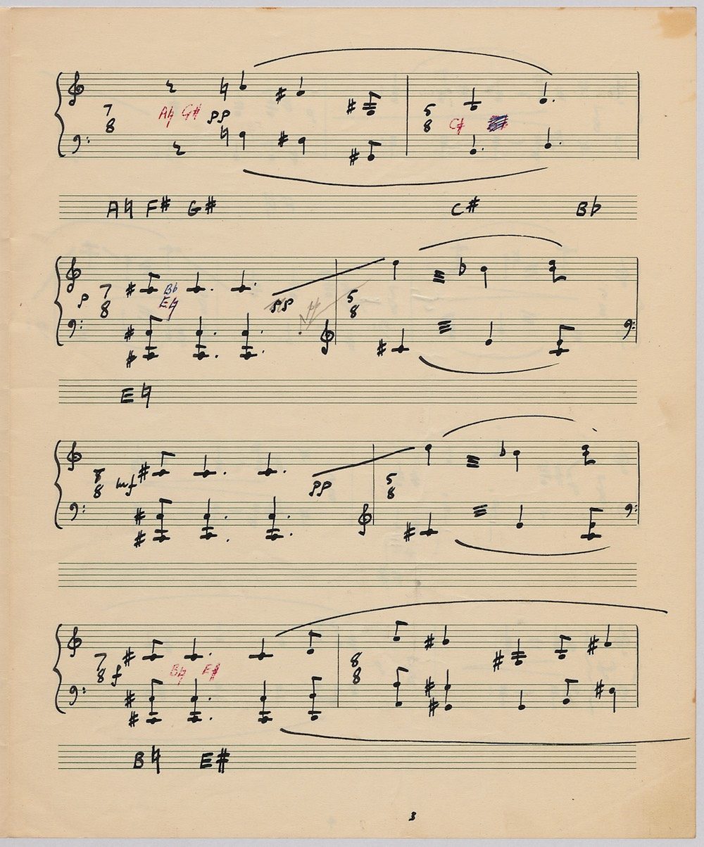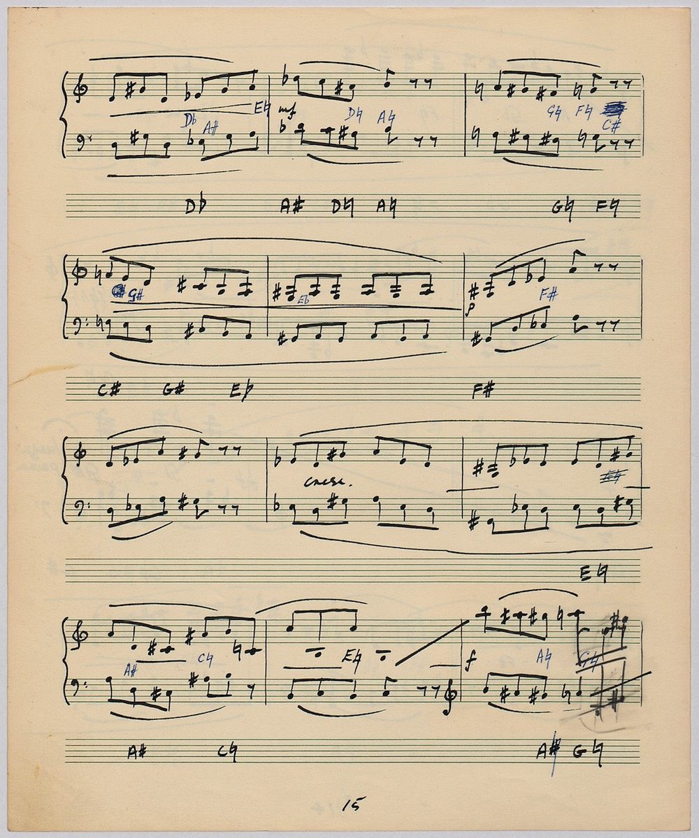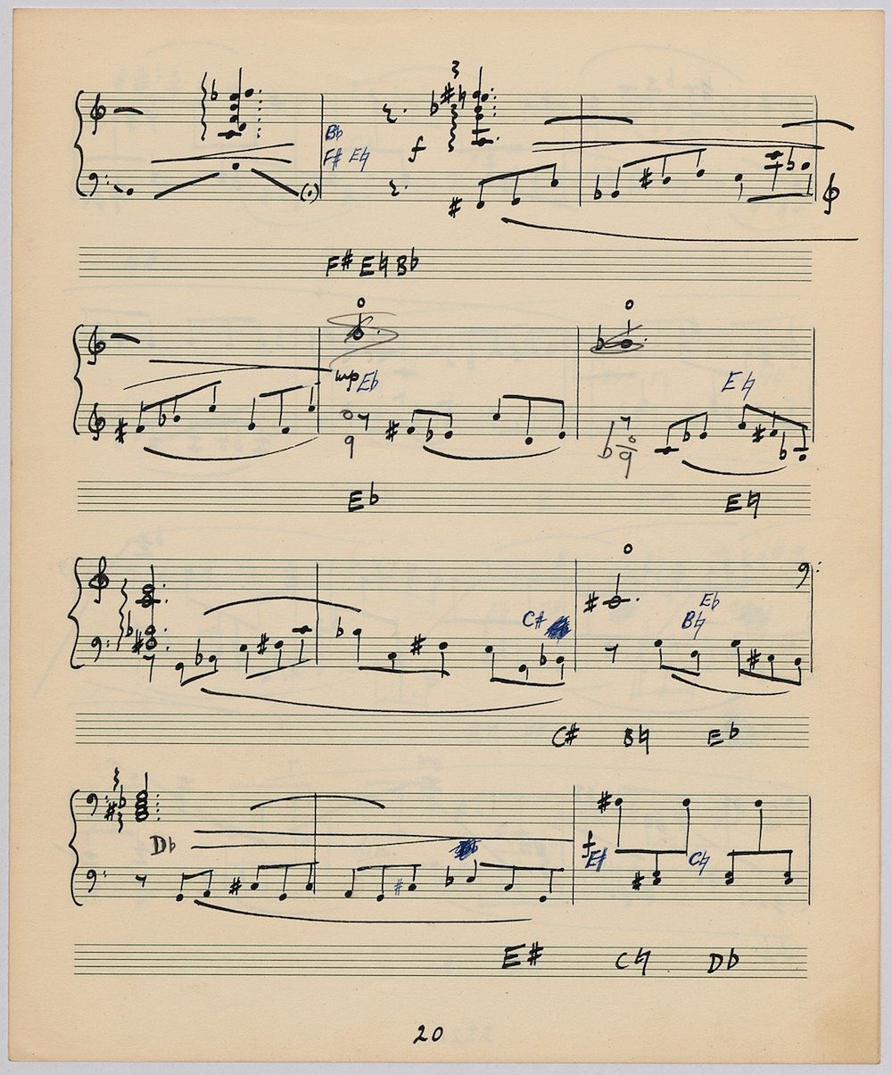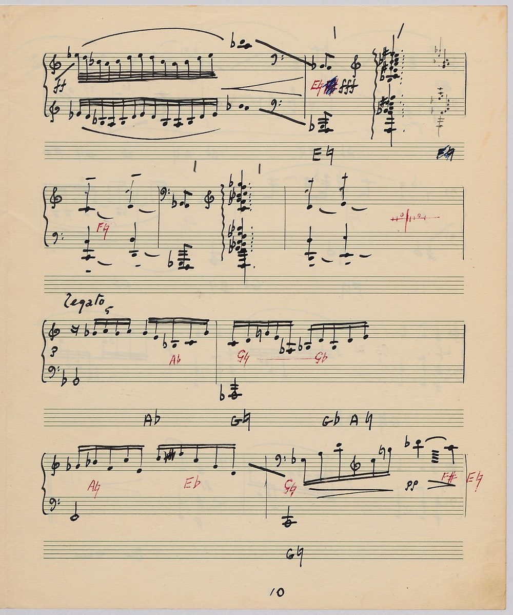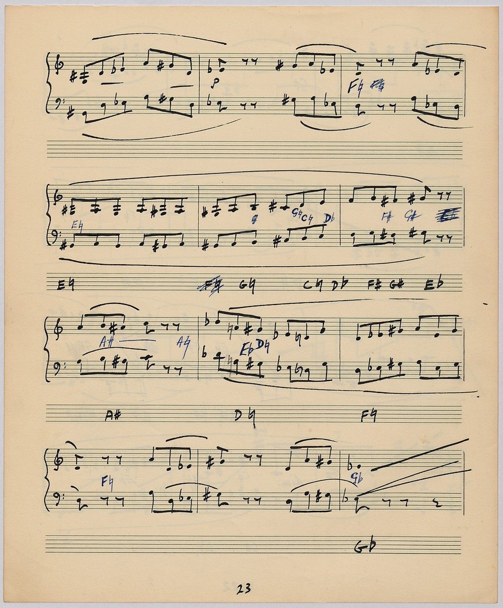 Hoddinott’s first piece for the brilliant harpist Osian Ellis was a short solo Impromptu which he played at Cardiff Music Club on October 25th, 1956 but which the composer subsequently withdrew. The Harp Concerto, Op.11 followed in 1957 to a commission by Ellis who gave the premiere at the 1958 Cheltenham Festival where the composer conducted the Halle Orchestra. Hoddinott had first been to the Cheltenham Festival as a student shortly after its formation in 1945 and from 1954 onwards developed a close association with the event. The Piano Sonata No.1 was commissioned in 1959 and Symphony No.2 in 1962. The Harp Sonata followed in 1964, was premiered on July 12th in the Town Hall and has three contrasted movements lasting in total some 12 minutes. The screen shows the composer’s final ‘neat’ score together with some editing notes by Osian Ellis for the publication by OUP in 1967, and one page with a notational sketch. There is no recording of this Sonata to date. The composer’s other solo harp works are a Suite, Op.52 (1967) a Fantasy, Op.68 No.2 (1970) and a Second Sonata: Tempi, Op.164 (1997) which Catrin Finch has recorded on Sain SCD2484