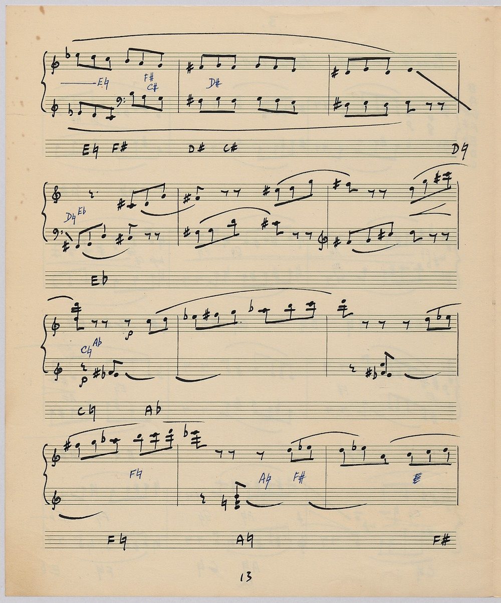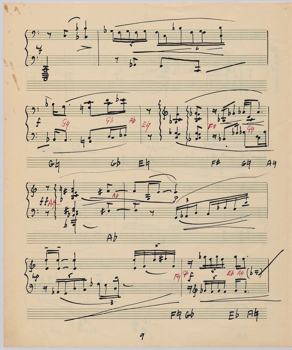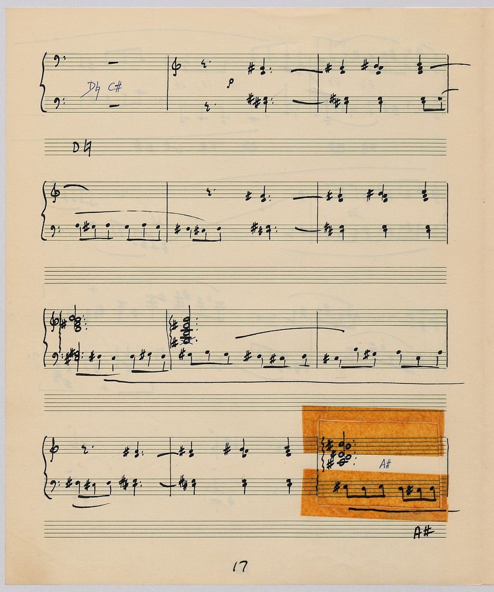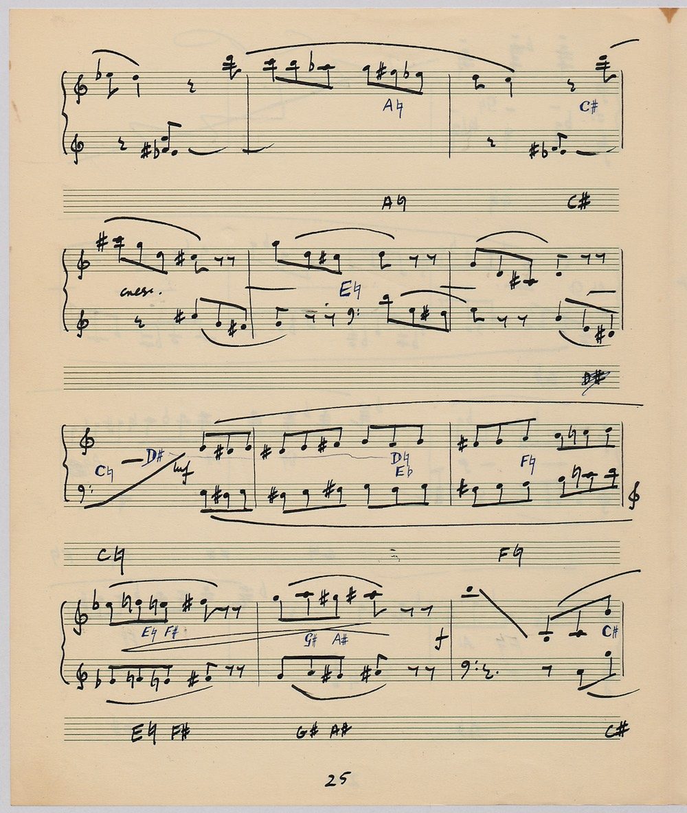 Hoddinott’s first piece for the brilliant harpist Osian Ellis was a short solo Impromptu which he played at Cardiff Music Club on October 25th, 1956 but which the composer subsequently withdrew. The Harp Concerto, Op.11 followed in 1957 to a commission by Ellis who gave the premiere at the 1958 Cheltenham Festival where the composer conducted the Halle Orchestra. Hoddinott had first been to the Cheltenham Festival as a student shortly after its formation in 1945 and from 1954 onwards developed a close association with the event. The Piano Sonata No.1 was commissioned in 1959 and Symphony No.2 in 1962. The Harp Sonata followed in 1964, was premiered on July 12th in the Town Hall and has three contrasted movements lasting in total some 12 minutes. The screen shows the composer’s final ‘neat’ score together with some editing notes by Osian Ellis for the publication by OUP in 1967, and one page with a notational sketch. There is no recording of this Sonata to date. The composer’s other solo harp works are a Suite, Op.52 (1967) a Fantasy, Op.68 No.2 (1970) and a Second Sonata: Tempi, Op.164 (1997) which Catrin Finch has recorded on Sain SCD2484