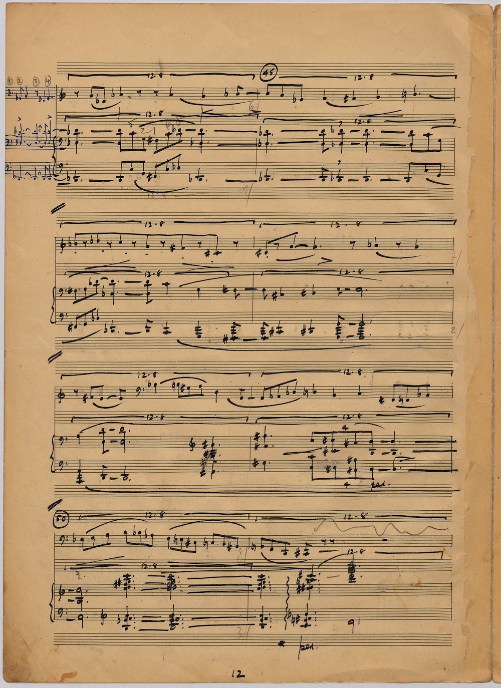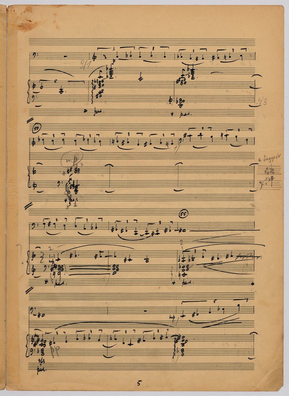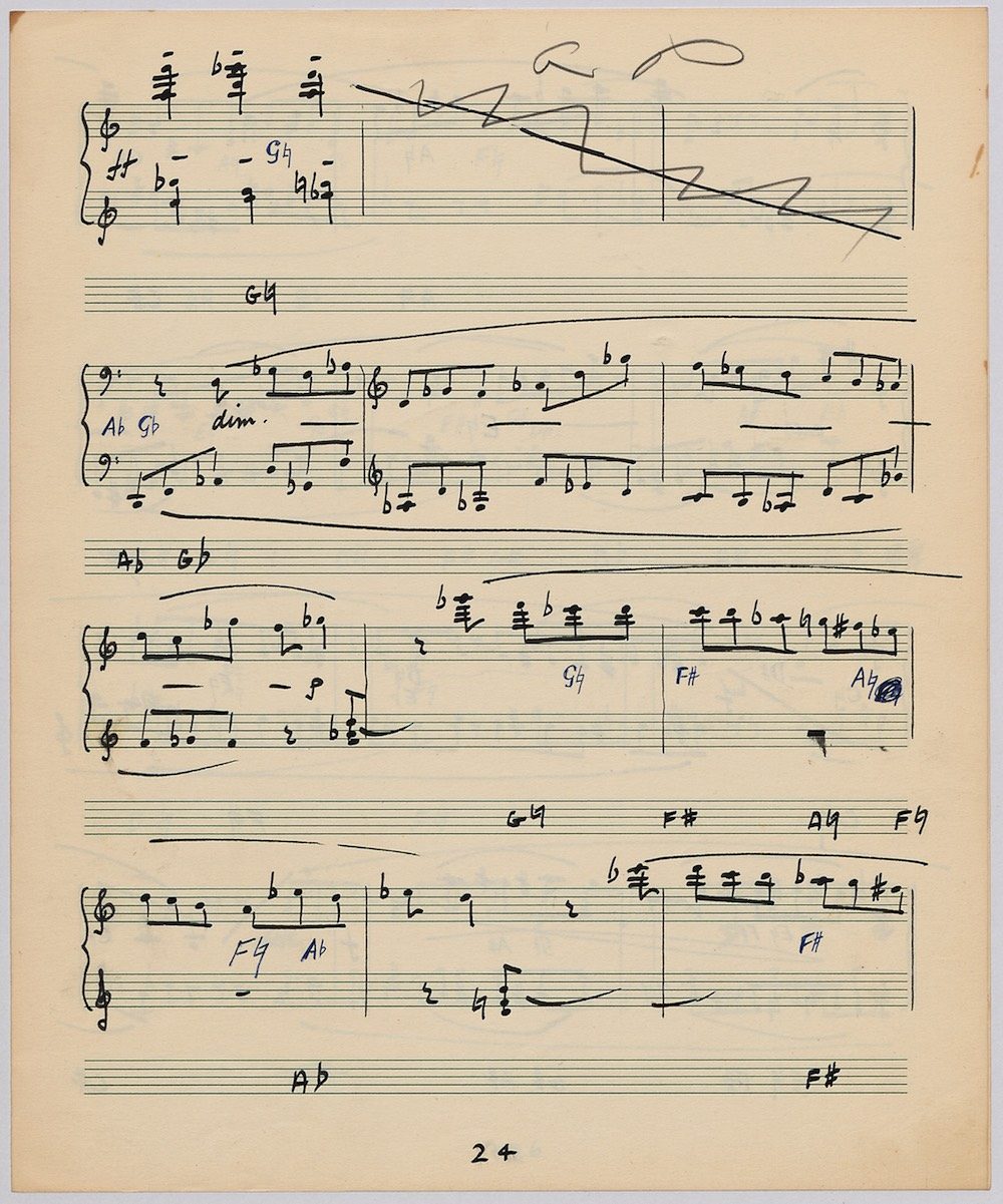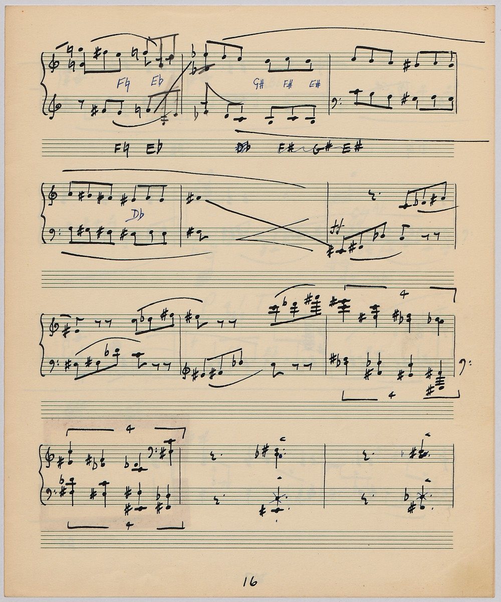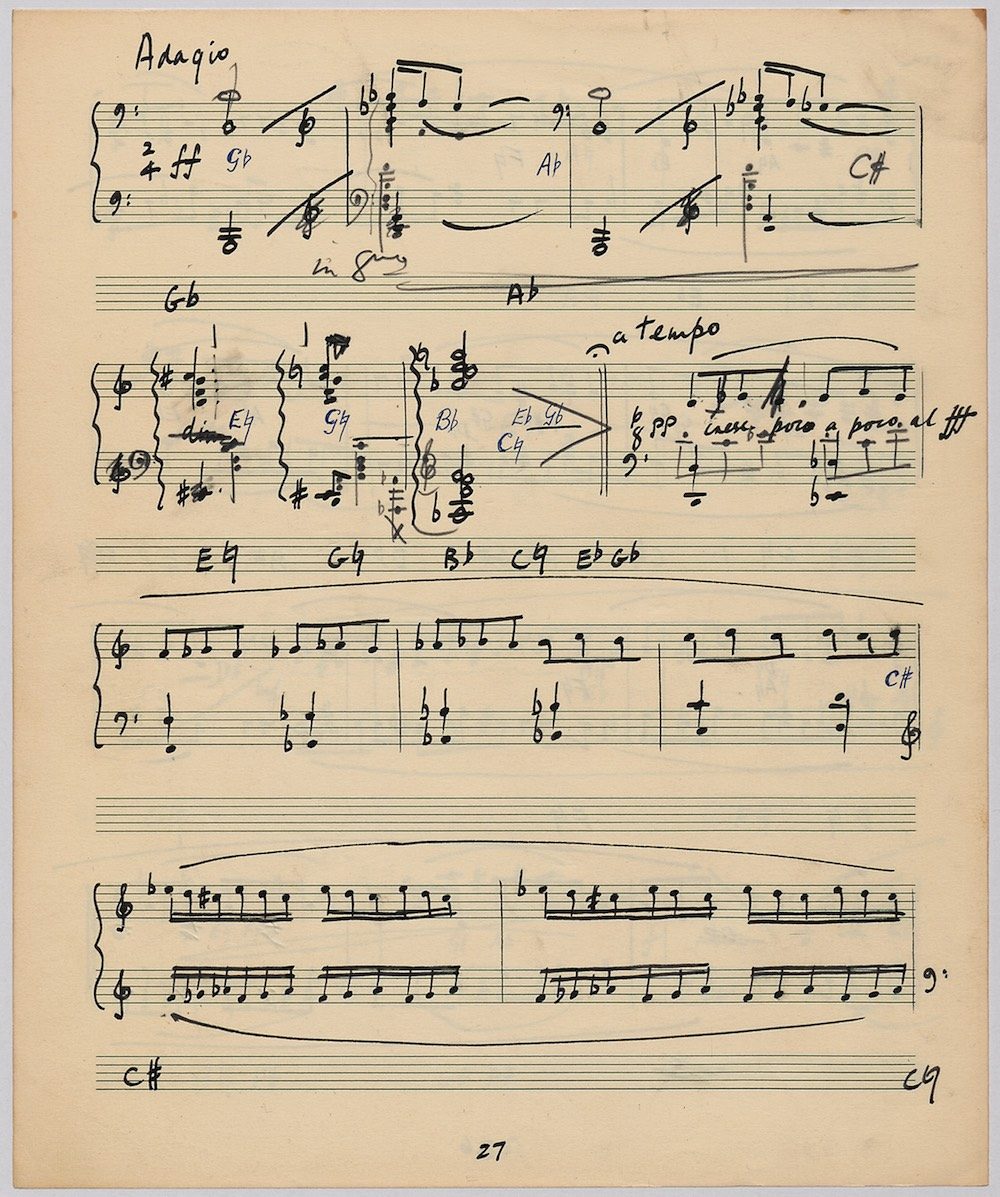Hoddinott’s first piece for the brilliant harpist Osian Ellis was a short solo Impromptu which he played at Cardiff Music Club on October 25th, 1956 but which the composer subsequently withdrew. The Harp Concerto, Op.11 followed in 1957 to a commission by Ellis who gave the premiere at the 1958 Cheltenham Festival where the composer conducted the Halle Orchestra. Hoddinott had first been to the Cheltenham Festival as a student shortly after its formation in 1945 and from 1954 onwards developed a close association with the event. The Piano Sonata No.1 was commissioned in 1959 and Symphony No.2 in 1962. The Harp Sonata followed in 1964, was premiered on July 12th in the Town Hall and has three contrasted movements lasting in total some 12 minutes. The screen shows the composer’s final ‘neat’ score together with some editing notes by Osian Ellis for the publication by OUP in 1967, and one page with a notational sketch. There is no recording of this Sonata to date. The composer’s other solo harp works are a Suite, Op.52 (1967) a Fantasy, Op.68 No.2 (1970) and a Second Sonata: Tempi, Op.164 (1997) which Catrin Finch has recorded on Sain SCD2484
