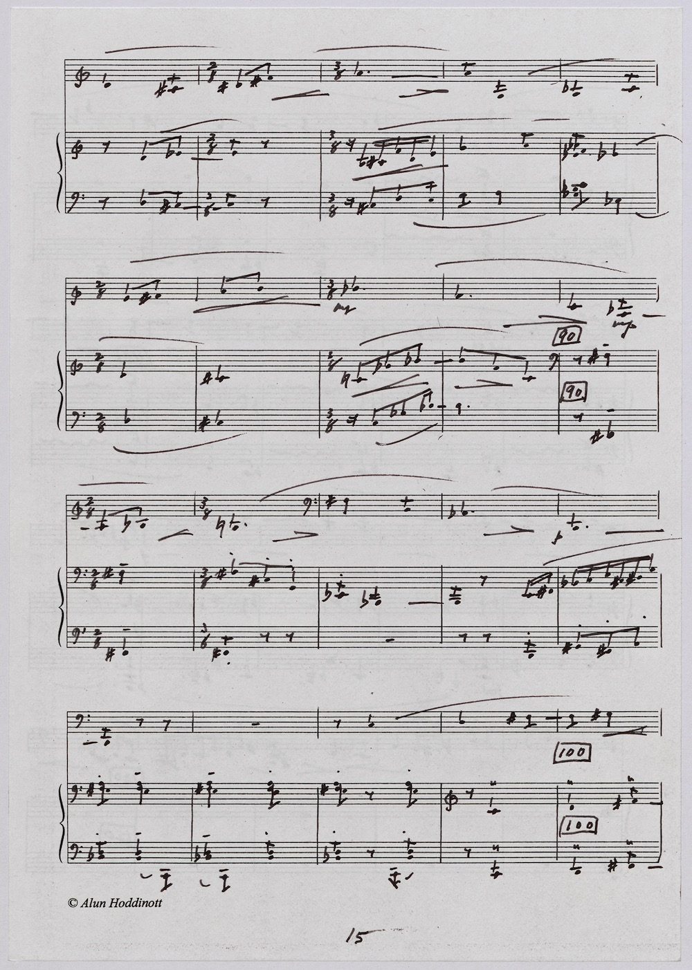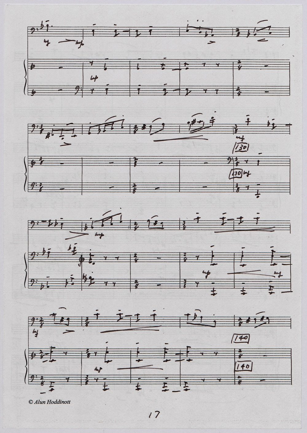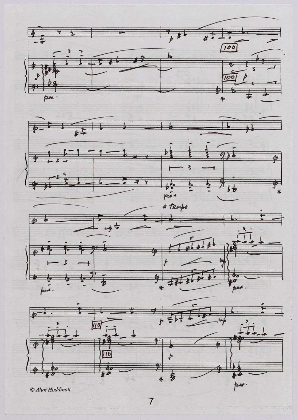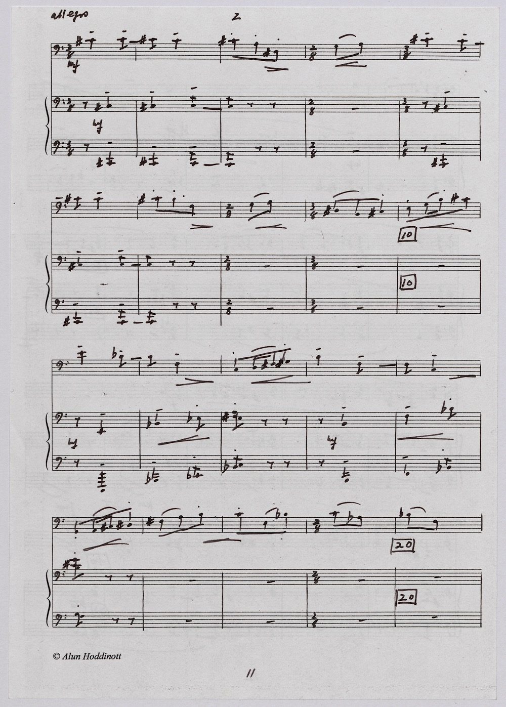 Hoddinott was always keen to respond to gifted young instrumentalists and singers and one of the performers with whom he developed a close bond in his later years was the exceptional young euphonium player David Childs. In 2002 he wrote a Concerto for him entitled ‘The Sunne Rising’, op.180, which was a punning reference (via John Donne) to the fact that Childs was the son of another very distinguished brass player and conductor, Robert Childs. David went on to play the Concerto at the 2004 Proms in London and later recorded it for Chandos. Far from exhausting his interest in this noble instrument Hoddinott went on almost immediately to follow the Concerto with a Sonata, which Childs, together with pianist John Wilson premiered at the Wigmore Hall on April 7th 2003. Its two movements – Andante and Allegro – last around ten minutes and deliberately emphasise the lyrical eloquence and rhythmic agility of an instrument not often associated with either characteristic. The screen shows the final manuscript which was then published by Oriana Publications in 2003.