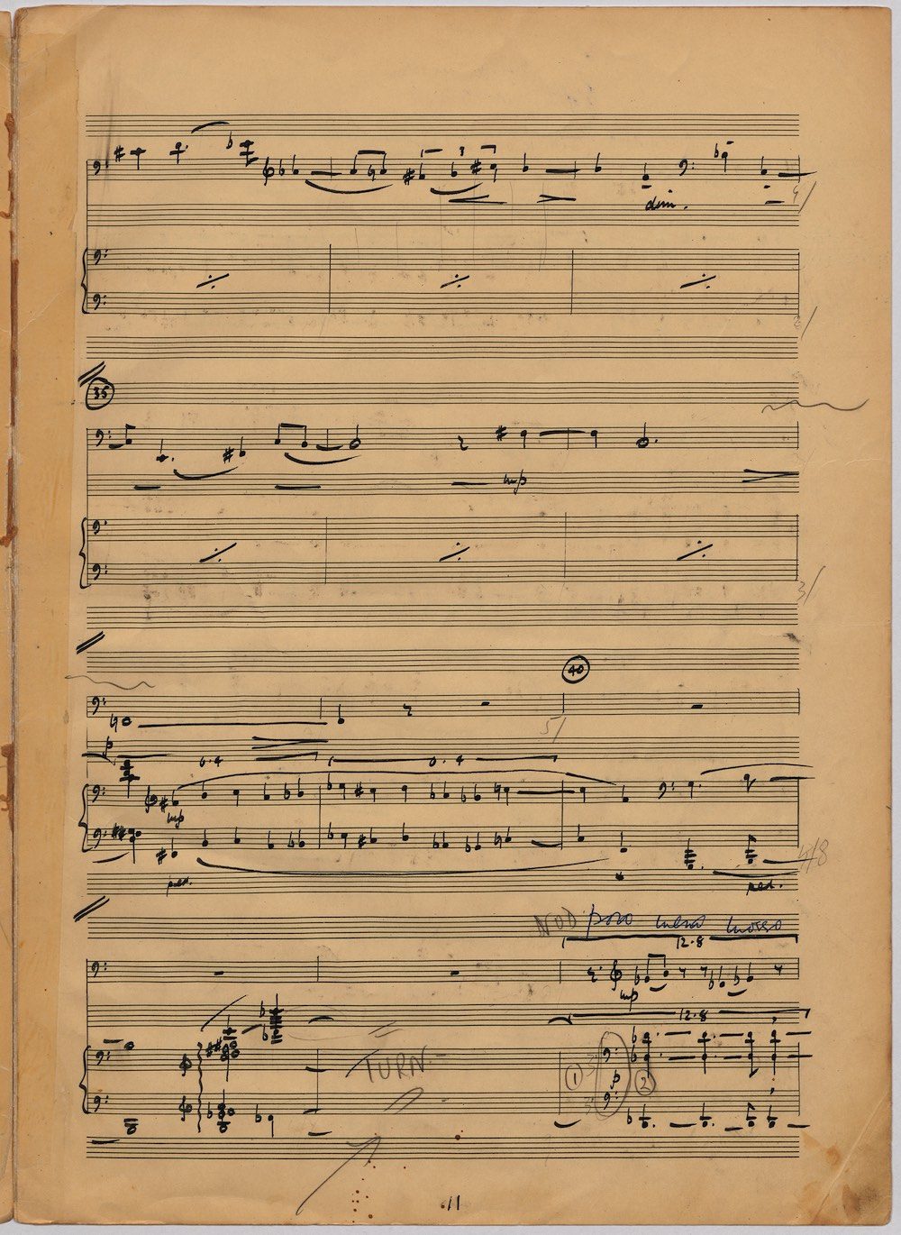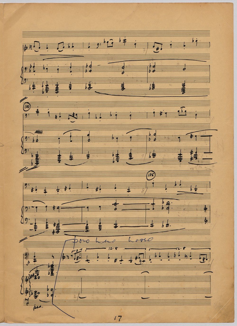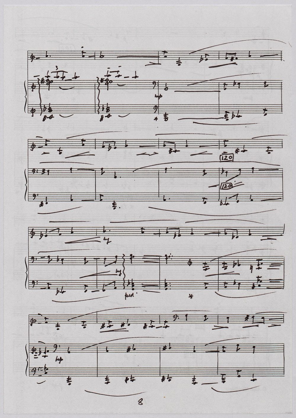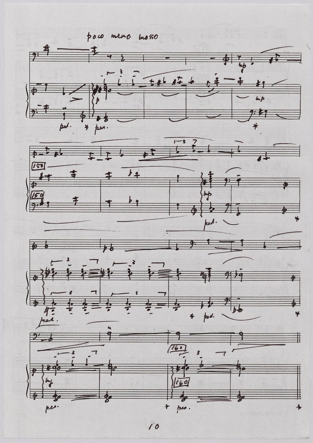 Hoddinott was always keen to respond to gifted young instrumentalists and singers and one of the performers with whom he developed a close bond in his later years was the exceptional young euphonium player David Childs. In 2002 he wrote a Concerto for him entitled ‘The Sunne Rising’, op.180, which was a punning reference (via John Donne) to the fact that Childs was the son of another very distinguished brass player and conductor, Robert Childs. David went on to play the Concerto at the 2004 Proms in London and later recorded it for Chandos. Far from exhausting his interest in this noble instrument Hoddinott went on almost immediately to follow the Concerto with a Sonata, which Childs, together with pianist John Wilson premiered at the Wigmore Hall on April 7th 2003. Its two movements – Andante and Allegro – last around ten minutes and deliberately emphasise the lyrical eloquence and rhythmic agility of an instrument not often associated with either characteristic. The screen shows the final manuscript which was then published by Oriana Publications in 2003.