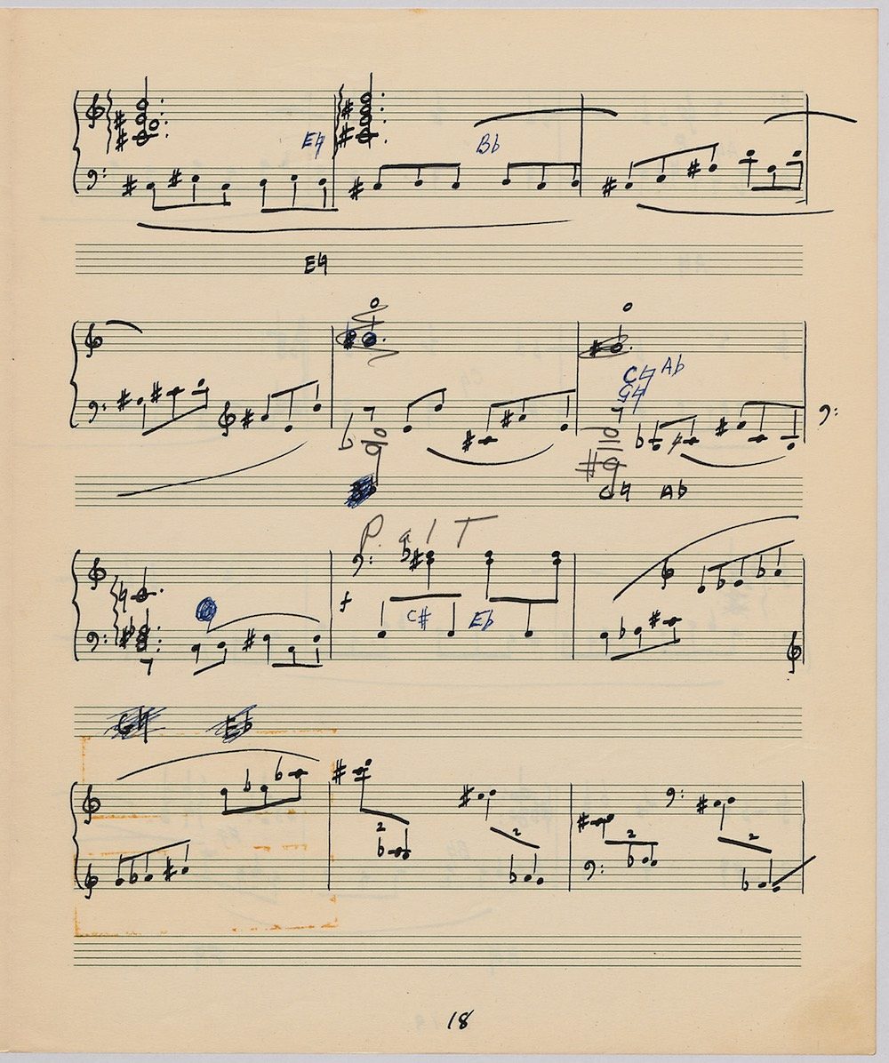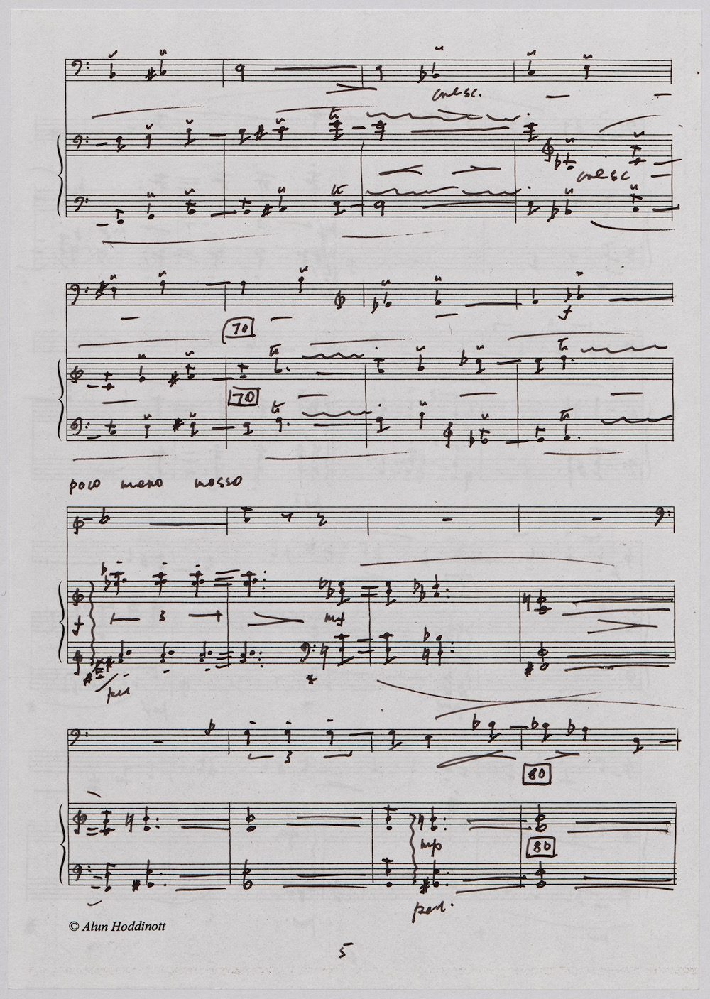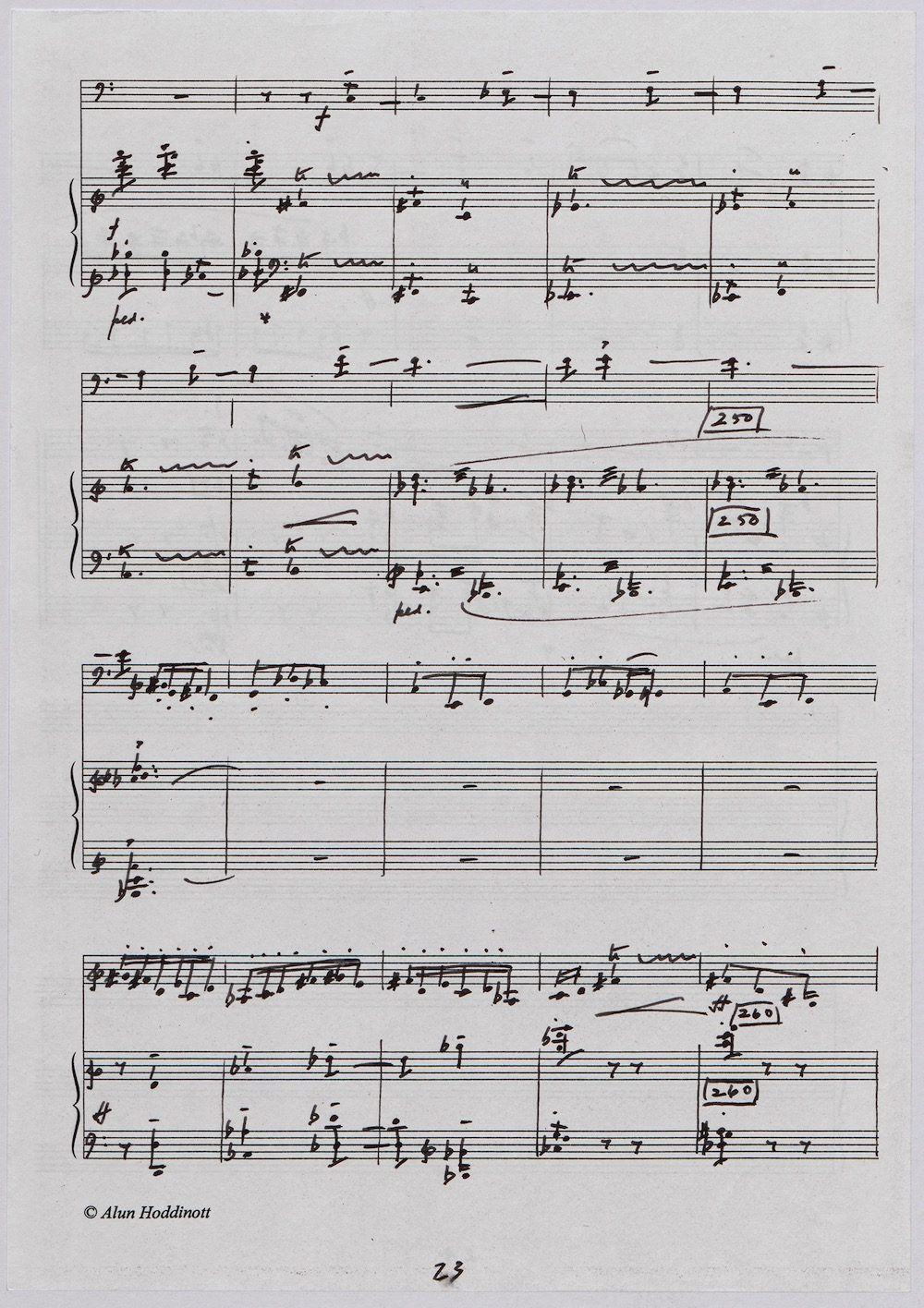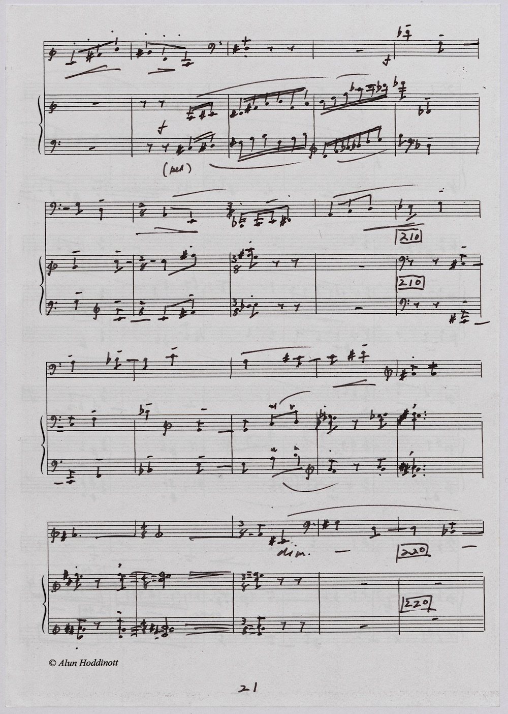Hoddinott first made a mark as a composer with his Clarinet Concerto (1950) which the BBC broadcast from Cardiff in 1951. The first public performance at the 1954 Cheltenham Festival then put the composer on the international map and he went on to compose an Oboe Concerto in 1955 and a Harp Concerto for Osian Ellis in 1957. In 1960 came the first two of Hoddinott’s three piano concertos. His relish of the concerto form is evident in the mercurial brilliance with which he varies these two works, whose composition was only separated by the Sextet Op.20, and the first of which is accompanied by wind, brass and percussion only. Both were composed for pianist Valerie Tryon, a contemporary specialist, and No.2 was premiered at the National Eisteddfod held in Cardiff, with the composer conducting the London Symphony Orchestra. In three contrasted movements: Moderato – Adagio – Allegro, the work lasts 20 minutes and is available on a Lyrita recording played by Martin Jones with the RPO conducted by Sir Andrew Davis. The screen shows the first 5 pages of the composer’s neat score of his arrangement for two pianos designed specifically for publication by Oxford University Press in 1968.
