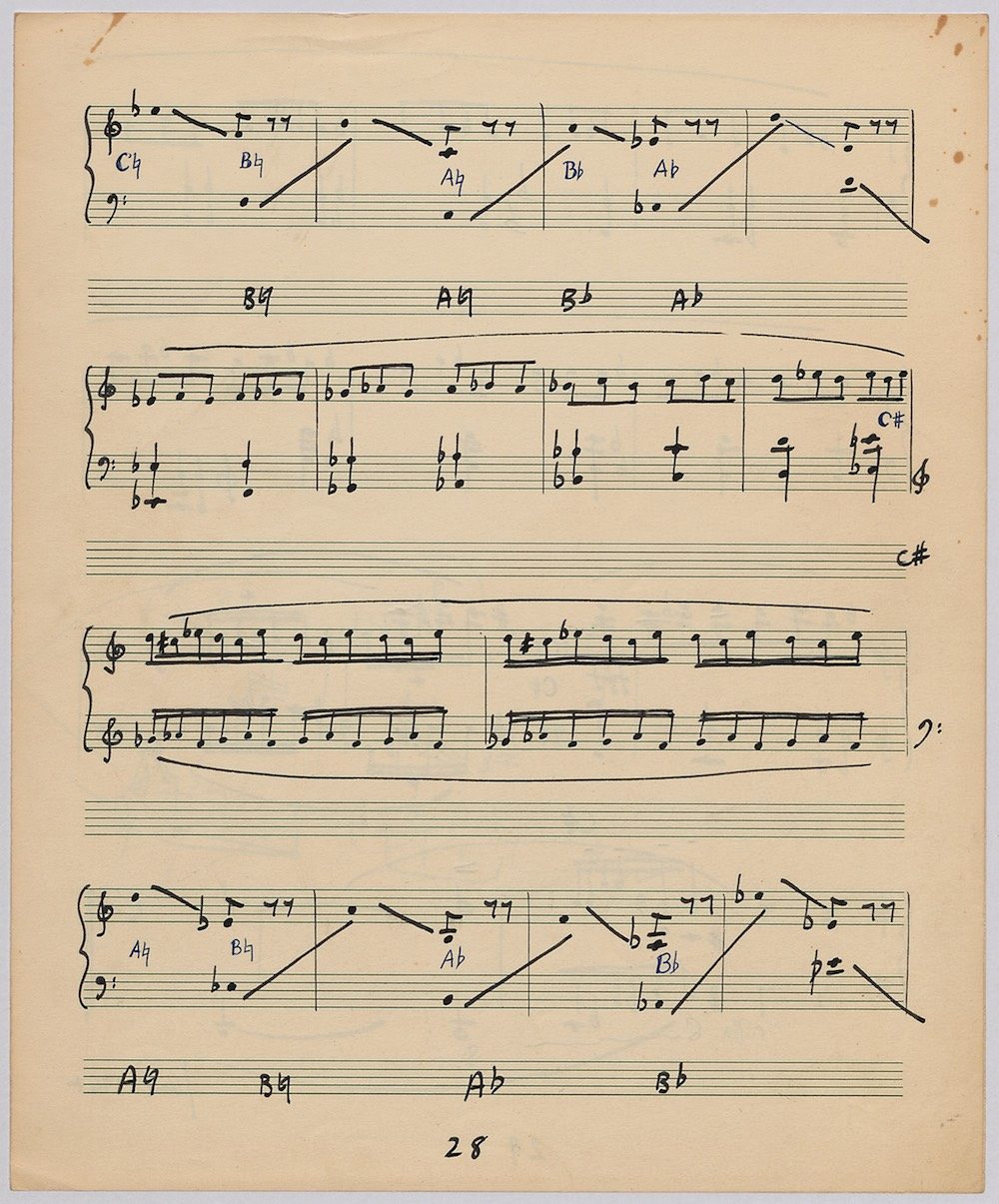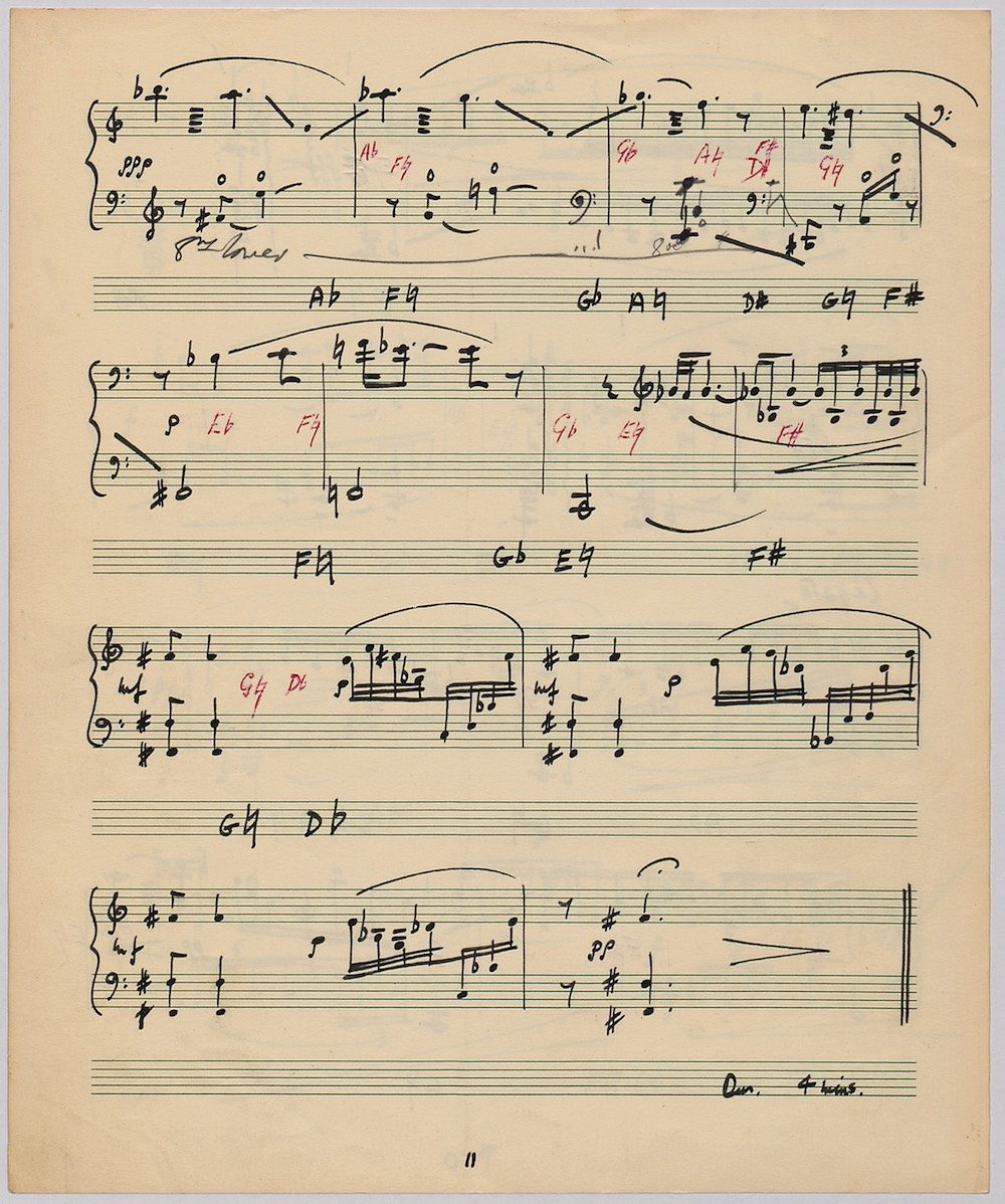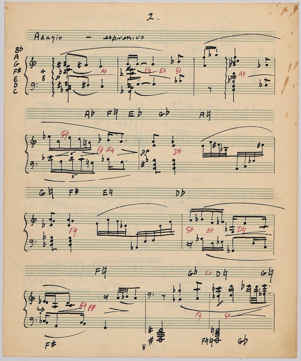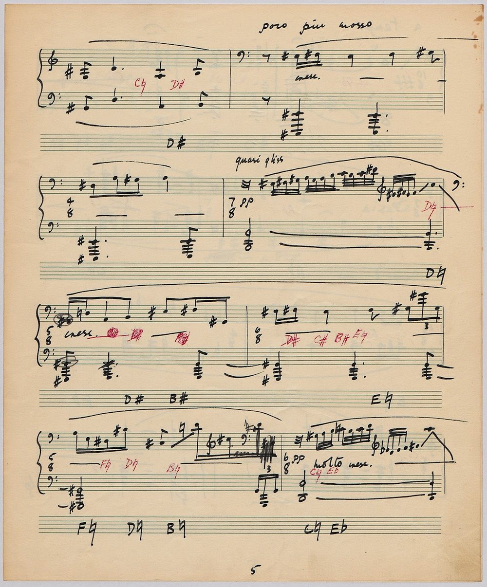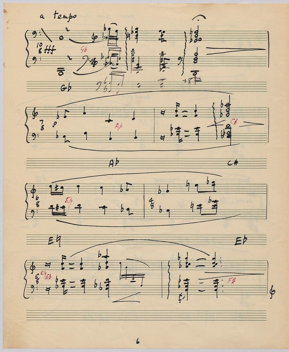 Hoddinott first made a mark as a composer with his Clarinet Concerto (1950) which the BBC broadcast from Cardiff in 1951. The first public performance at the 1954 Cheltenham Festival then put the composer on the international map and he went on to compose an Oboe Concerto in 1955 and a Harp Concerto for Osian Ellis in 1957. In 1960 came the first two of Hoddinott’s three piano concertos. His relish of the concerto form is evident in the mercurial brilliance with which he varies these two works, whose composition was only separated by the Sextet Op.20, and the first of which is accompanied by wind, brass and percussion only. Both were composed for pianist Valerie Tryon, a contemporary specialist, and No.2 was premiered at the National Eisteddfod held in Cardiff, with the composer conducting the London Symphony Orchestra. In three contrasted movements: Moderato – Adagio – Allegro, the work lasts 20 minutes and is available on a Lyrita recording played by Martin Jones with the RPO conducted by Sir Andrew Davis. The screen shows the first 5 pages of the composer’s neat score of his arrangement for two pianos designed specifically for publication by Oxford University Press in 1968.