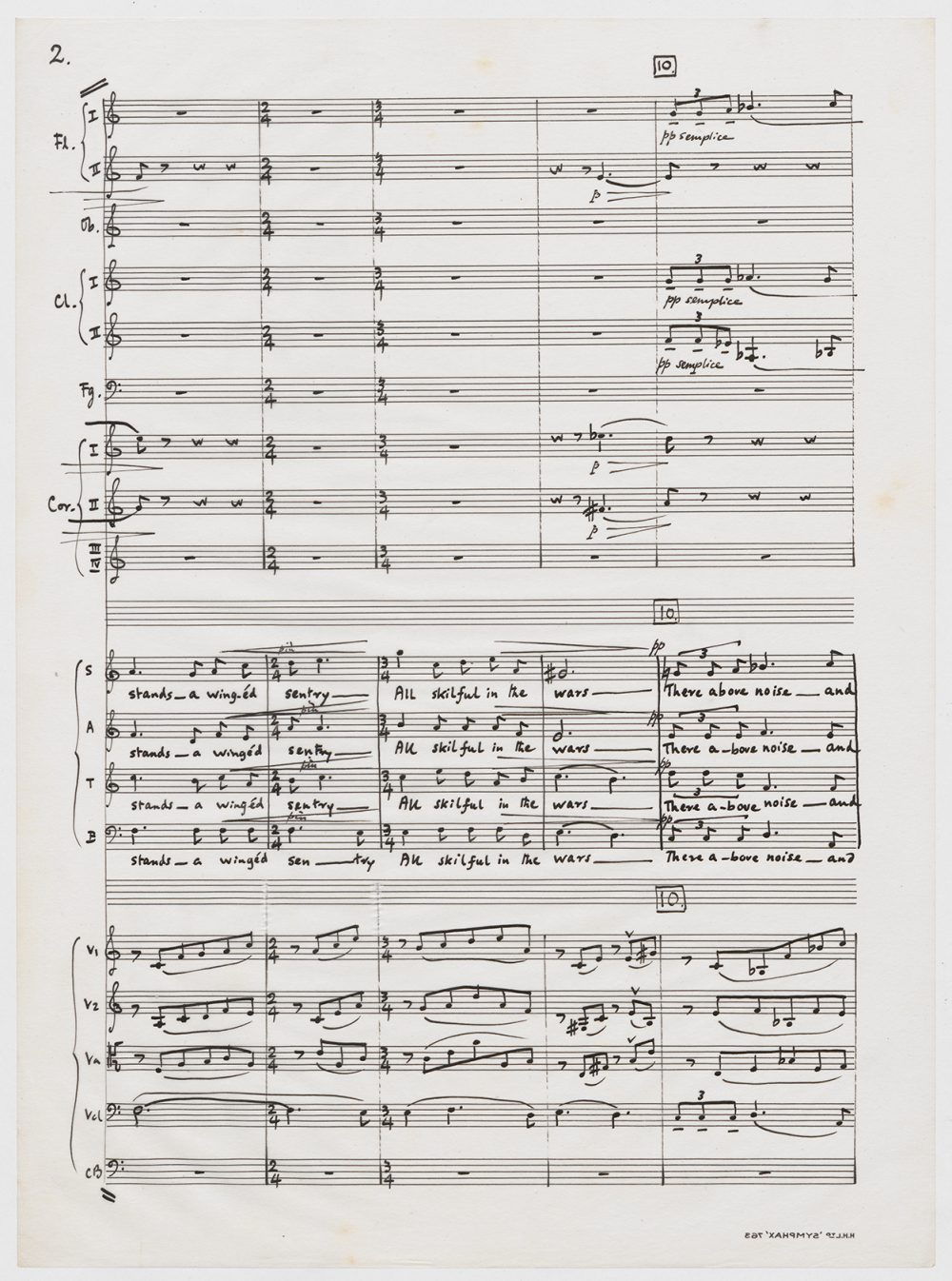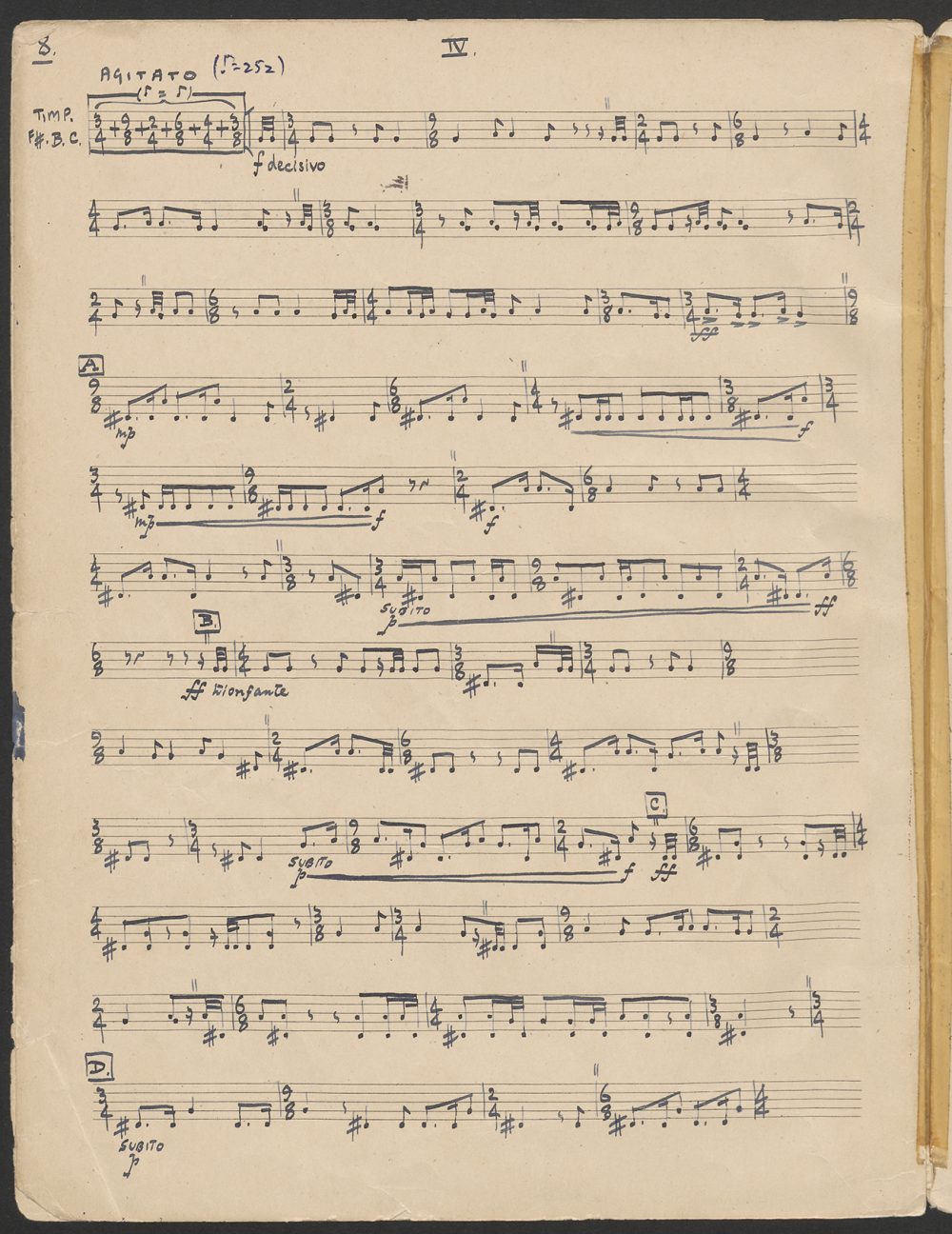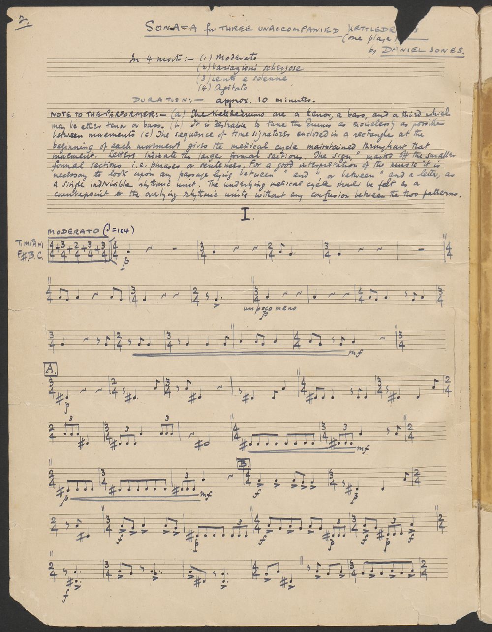 Daniel Jones’s system of complex metres is underlined in the Sonata for Unaccompanied Kettledrums which was formulated during the 1940s particularly during his time in Bletchley Park, but also from his period studying and travelling in Europe as the winner of the prestigious Mendelssohn Scholarship. During these years, other composers were experimenting with metre and they included Boris Blacher and Elliott Carter. Jones’s notion of following (for example) 9/8+3/4+2/4+6/8+2/4+2/8+3/8 lends to the music a characteristic ambiguity. The Sonata utilises rhythm as a structural element within a sonata-allegro framework and milieu. As one of the composer’s earliest published works, it rapidly gained international acknowledgment.
