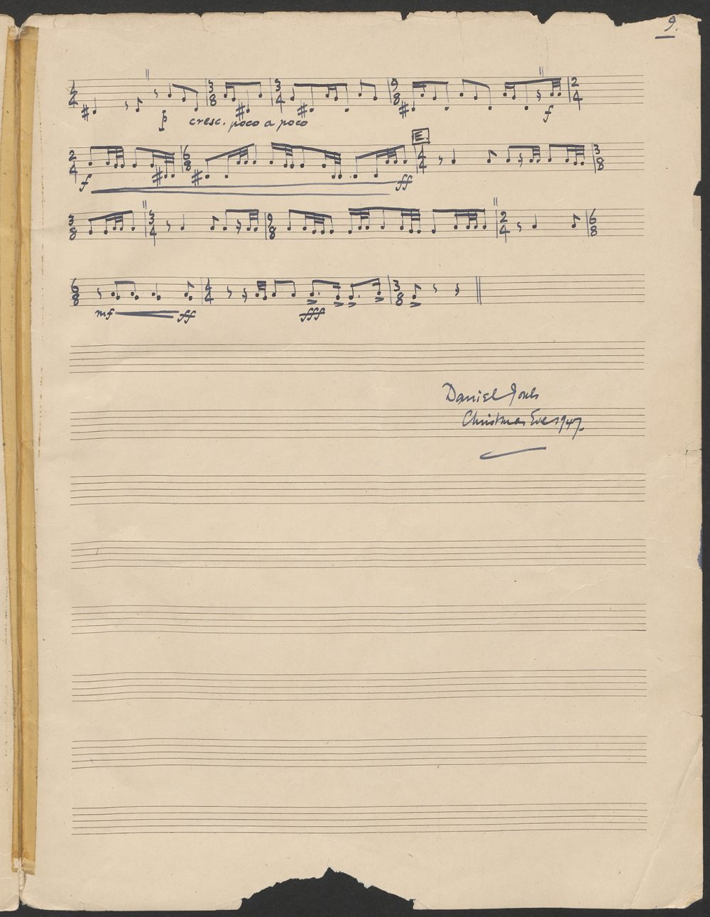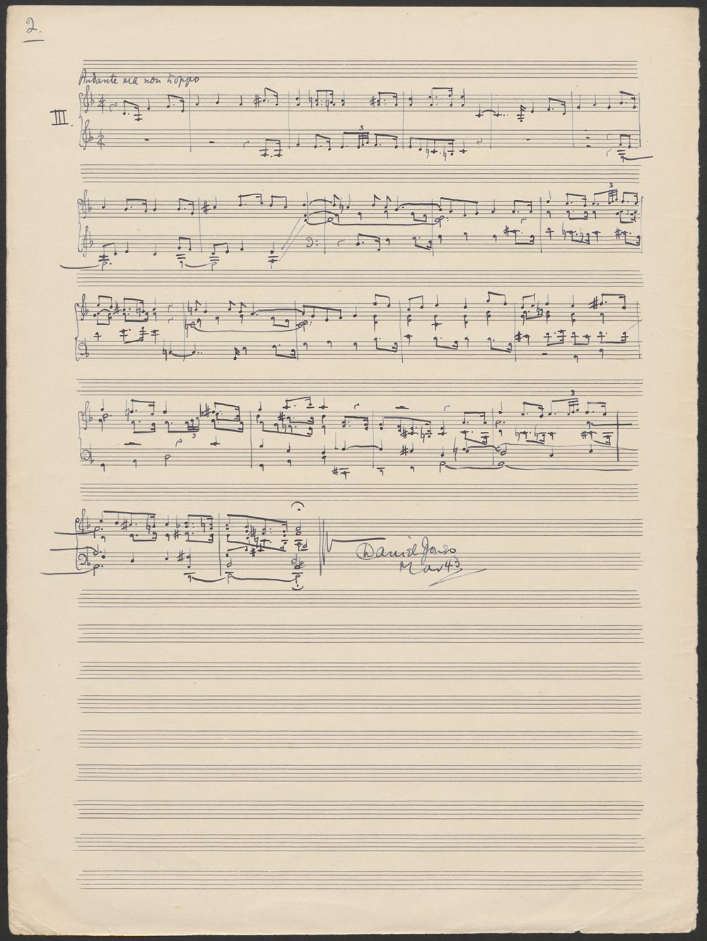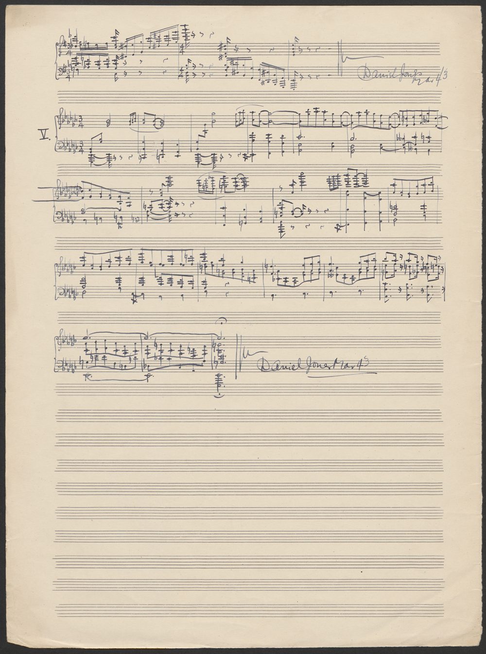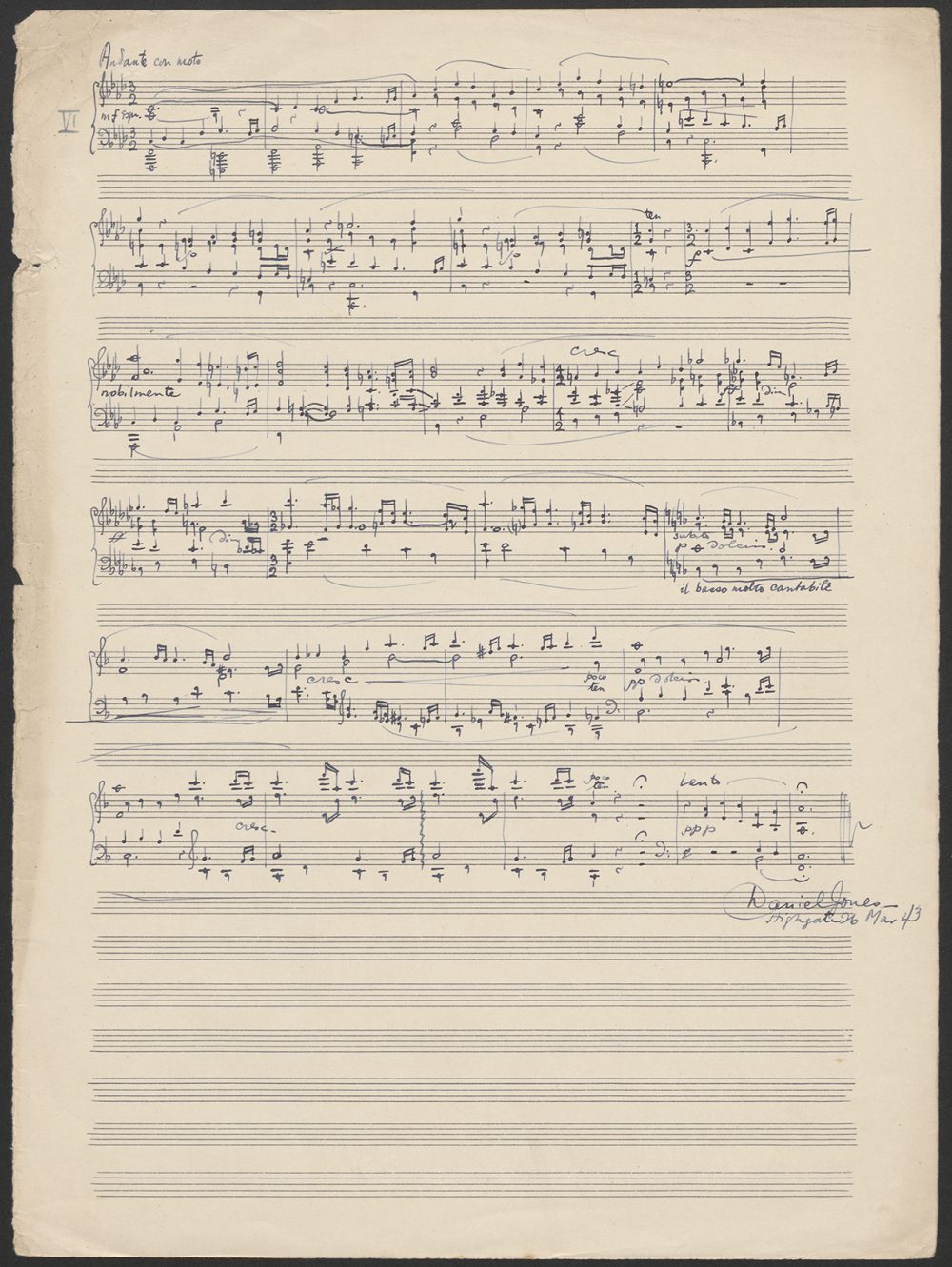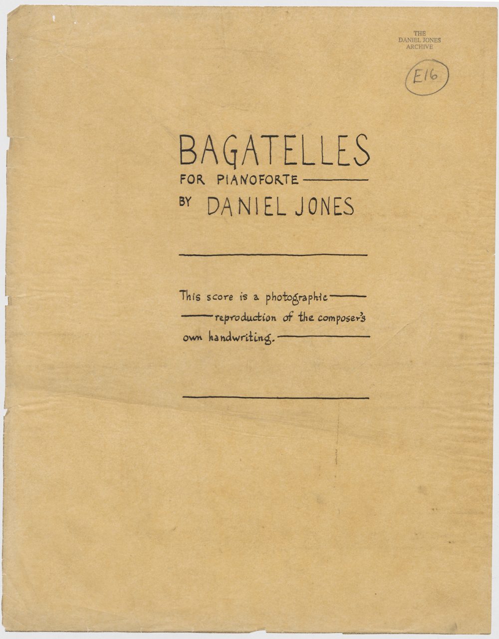 Chamber music was central to Jones’s work. Surprisingly for such a fine pianist, he wrote little for the instrument after discarding a considerable body of works composed in his youth. His first set of Bagatelles was composed during 1943-5 and explores a wide range of emotions and pianist textures. In this manusctript, II-V correspond to 1-4 in the published edition. I and VI were not published although VI was recorded by Llŷr Williams on the disc of Bagetelles by Tŷ Cerdd.