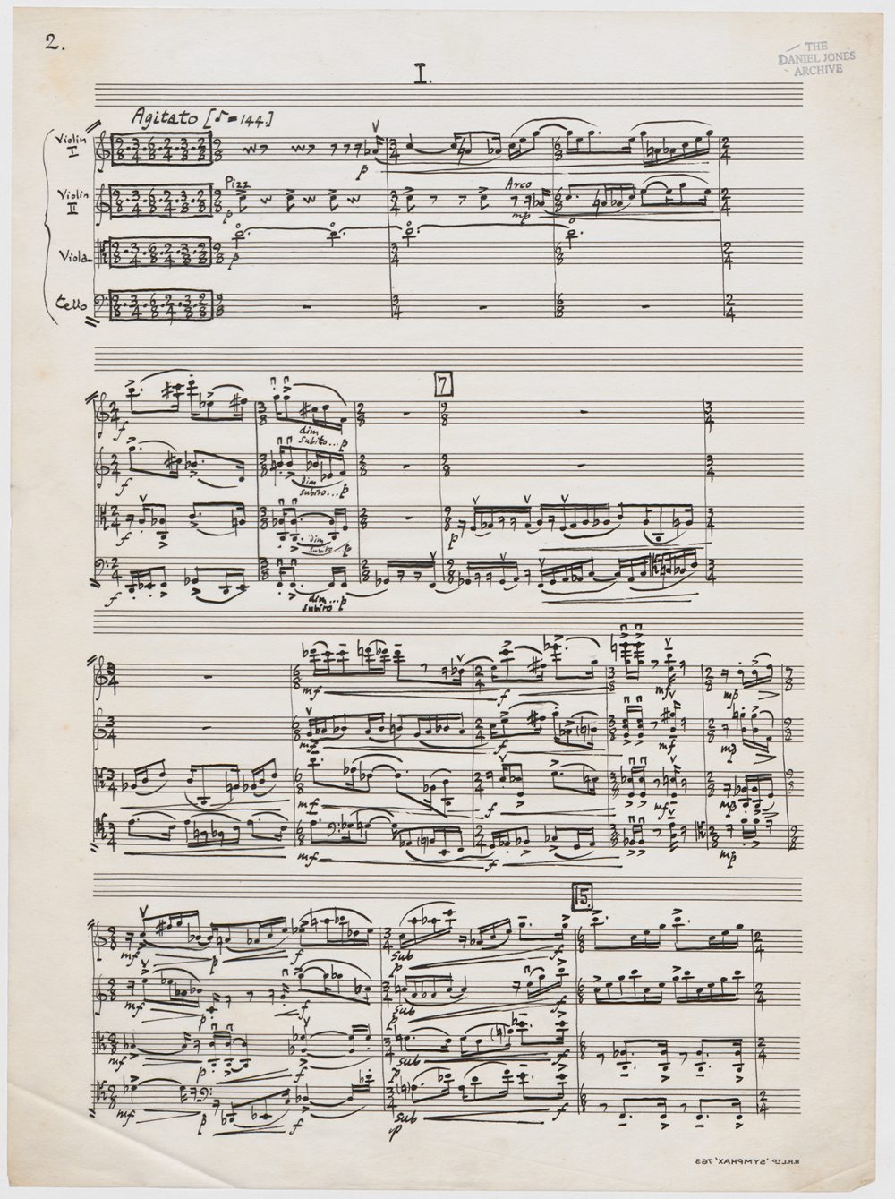 String Quartet (1957) again employs the sonata-allegro principle in idiomatically written string discourse. Thematic material is highly organised, and thematic links are ever-present throughout. The four movements are called: ‘Agitato’, ‘Lento espressivo’, ‘Allegro risoluto’, and a final ‘Agitato’. In themselves the titles reflect the content – Jones was to use ‘espressivo’ and ‘risoluto’ extensively (particularly in his chamber works) and they perfectly capture the spirit of the music.