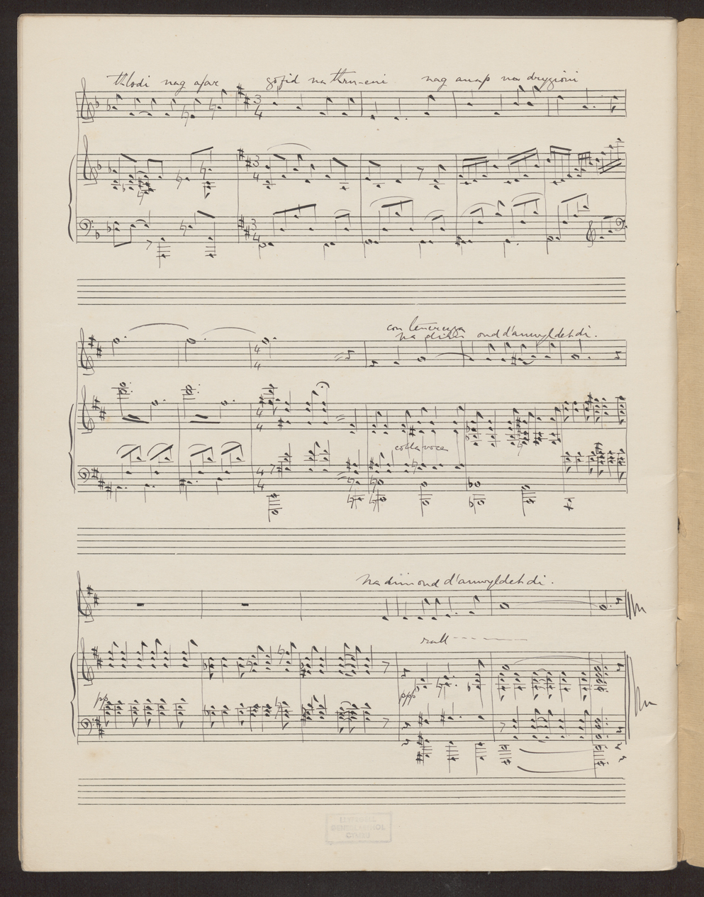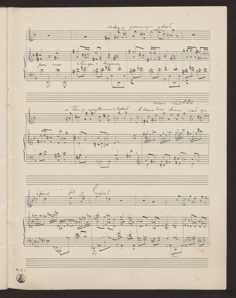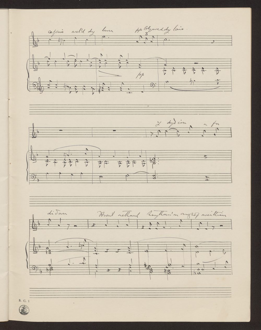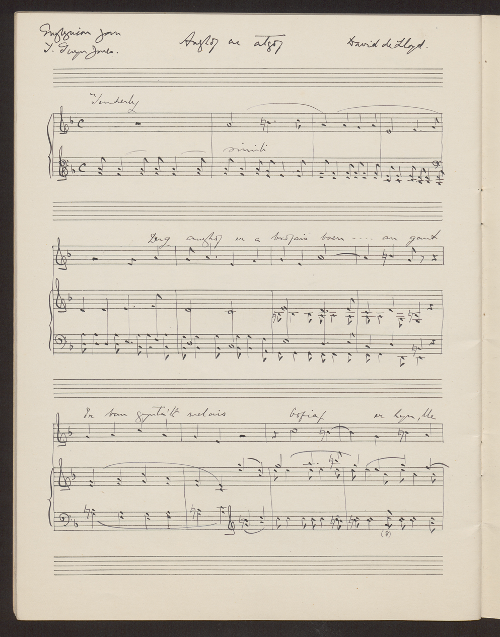 Although his output as a composer is by now largely unknown, he composed a number of interesting and attractive works. His extended anthem, Tu draw i’r llen / Beyond the veil (1924), a setting of words by the seventeenth-century poet Henry Vaughan, was dedicated to the memory of the College Principal, T. F. Roberts, who had died in 1919. His opera, Gwenllian, to a libretto by T. Gwynn Jones and Thomas Williams (Eurwedd), which is set in Wales at the time of the Crusades, was performed at the Coliseum in Aberystwyth in February 1924. A later opera, Tir na n-Og (1930), again with a libretto by T. Gwynn Jones, shows a distinct influence of Debussy. His cantata for children’s voices, Dydd a Nos / Day and Night (1927), setting words by various authors, was performed at the National Eisteddfod in Aberystwyth in 1952. He attempted to reflect Welsh and Celtic themes in his work, and arranged a number of traditional songs, including the collection Forty Welsh Traditional Tunes (1929). He also edited volumes of the songs of Brahms and Schubert with Welsh words by T. H. Parry-Williams.