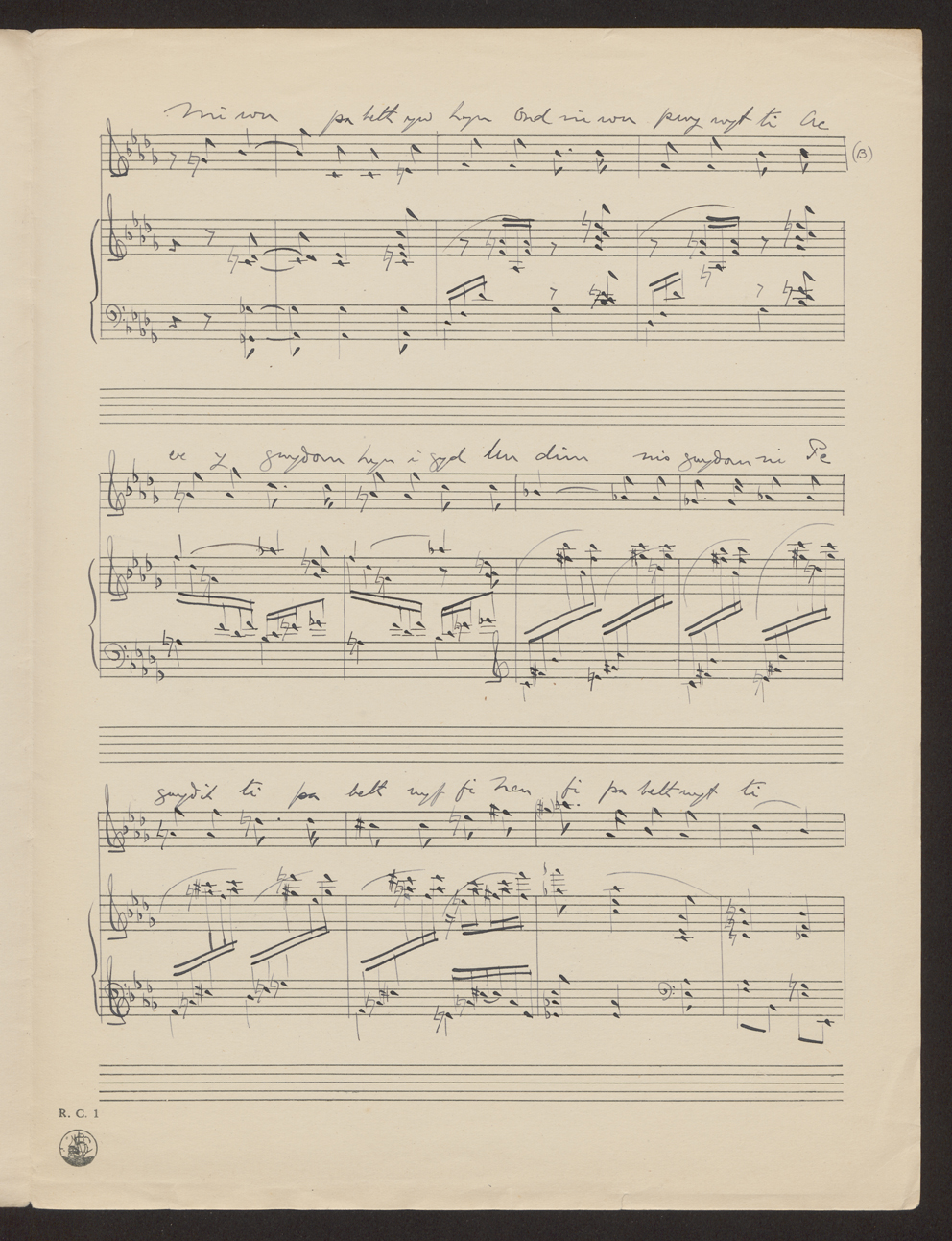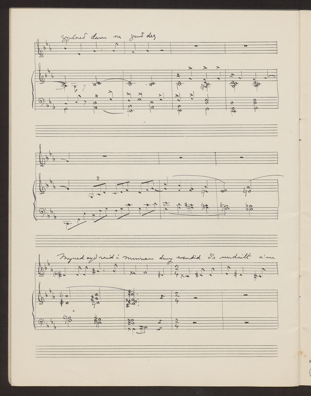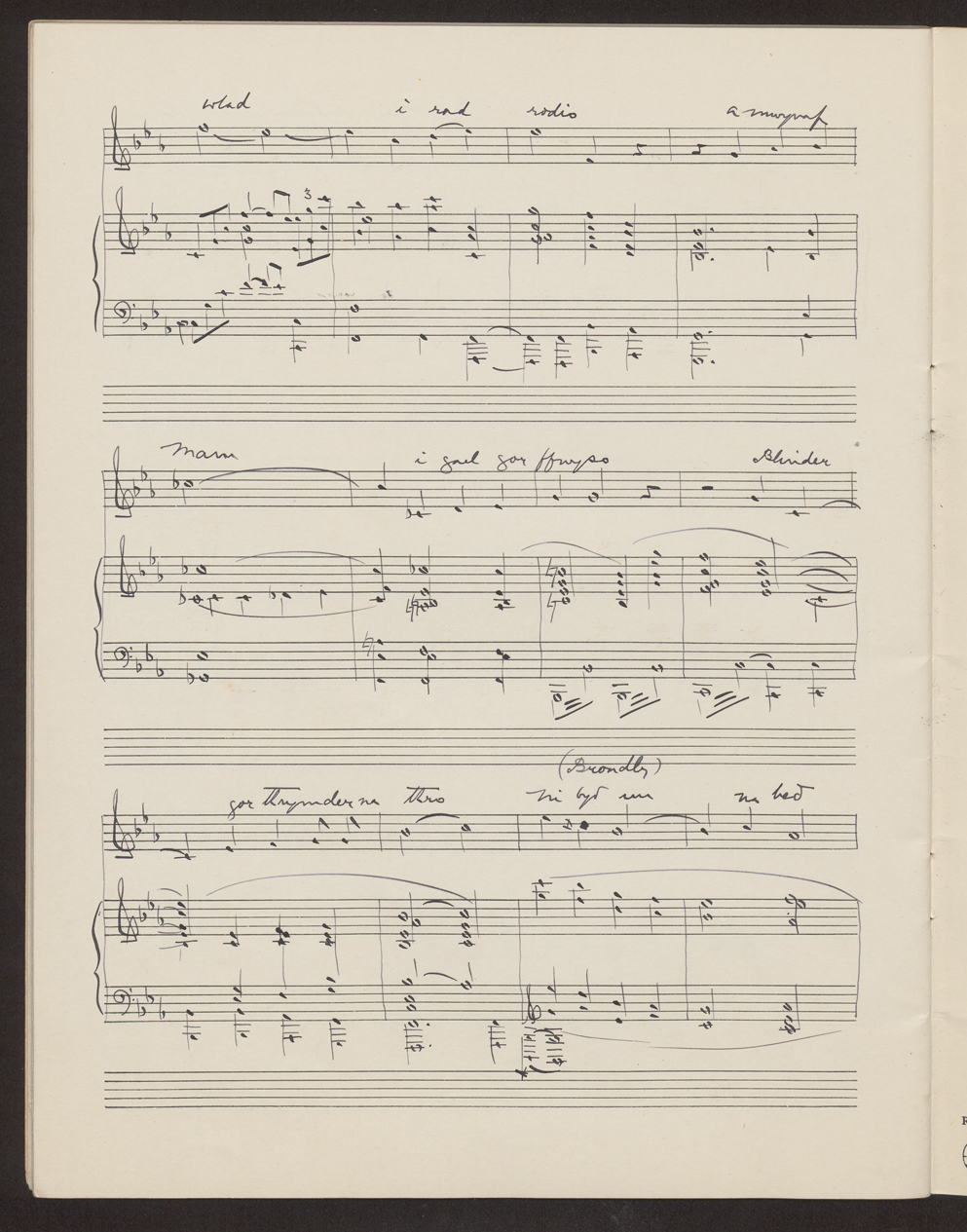 Although his output as a composer is by now largely unknown, he composed a number of interesting and attractive works. His extended anthem, Tu draw i’r llen / Beyond the veil (1924), a setting of words by the seventeenth-century poet Henry Vaughan, was dedicated to the memory of the College Principal, T. F. Roberts, who had died in 1919. His opera, Gwenllian, to a libretto by T. Gwynn Jones and Thomas Williams (Eurwedd), which is set in Wales at the time of the Crusades, was performed at the Coliseum in Aberystwyth in February 1924. A later opera, Tir na n-Og (1930), again with a libretto by T. Gwynn Jones, shows a distinct influence of Debussy. His cantata for children’s voices, Dydd a Nos / Day and Night (1927), setting words by various authors, was performed at the National Eisteddfod in Aberystwyth in 1952. He attempted to reflect Welsh and Celtic themes in his work, and arranged a number of traditional songs, including the collection Forty Welsh Traditional Tunes (1929). He also edited volumes of the songs of Brahms and Schubert with Welsh words by T. H. Parry-Williams.