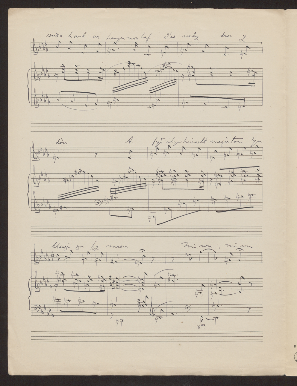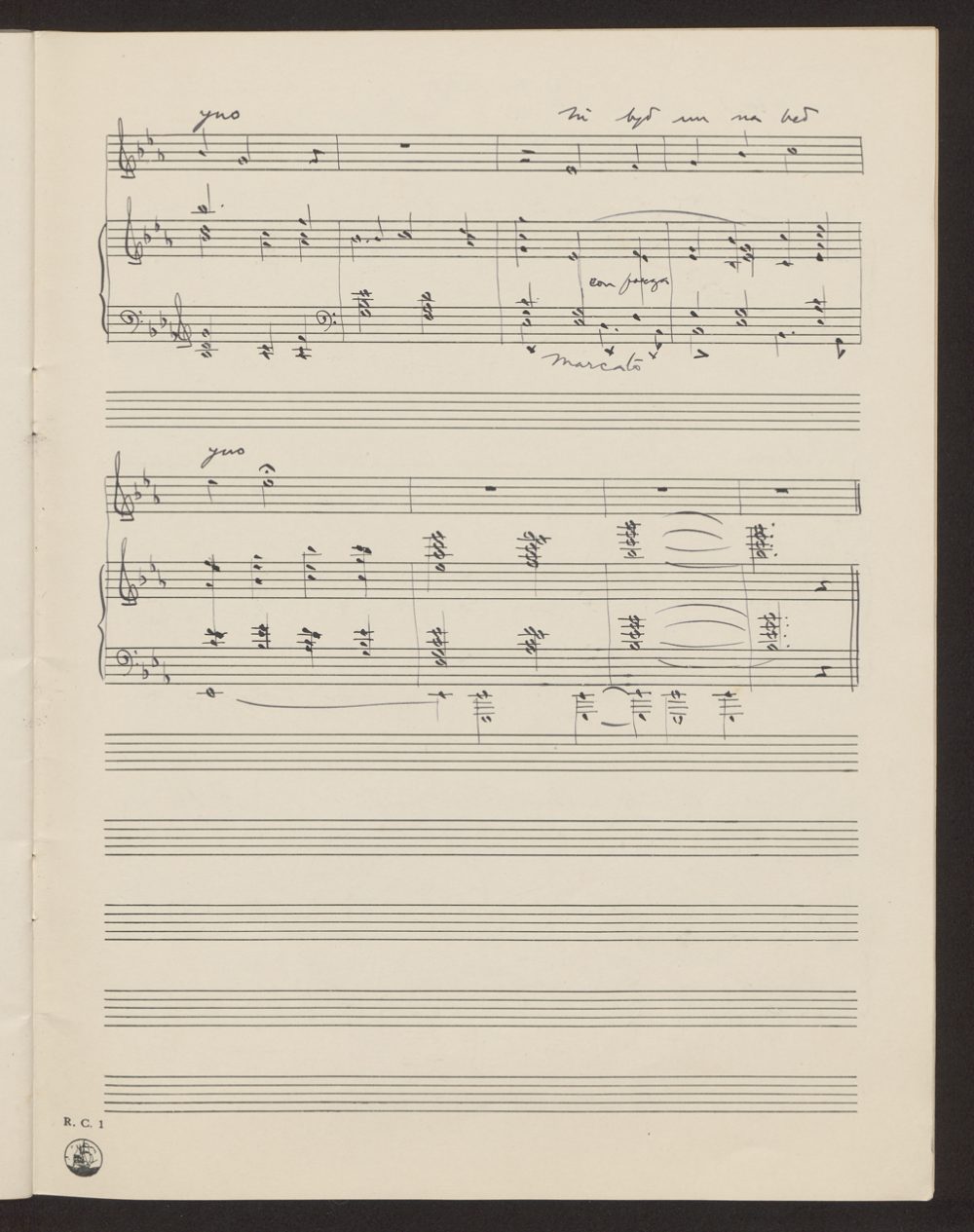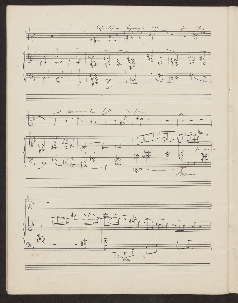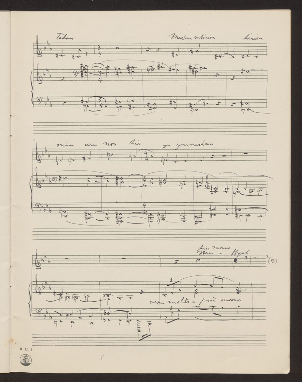 Although his output as a composer is by now largely unknown, he composed a number of interesting and attractive works. His extended anthem, Tu draw i’r llen / Beyond the veil (1924), a setting of words by the seventeenth-century poet Henry Vaughan, was dedicated to the memory of the College Principal, T. F. Roberts, who had died in 1919. His opera, Gwenllian, to a libretto by T. Gwynn Jones and Thomas Williams (Eurwedd), which is set in Wales at the time of the Crusades, was performed at the Coliseum in Aberystwyth in February 1924. A later opera, Tir na n-Og (1930), again with a libretto by T. Gwynn Jones, shows a distinct influence of Debussy. His cantata for children’s voices, Dydd a Nos / Day and Night (1927), setting words by various authors, was performed at the National Eisteddfod in Aberystwyth in 1952. He attempted to reflect Welsh and Celtic themes in his work, and arranged a number of traditional songs, including the collection Forty Welsh Traditional Tunes (1929). He also edited volumes of the songs of Brahms and Schubert with Welsh words by T. H. Parry-Williams.