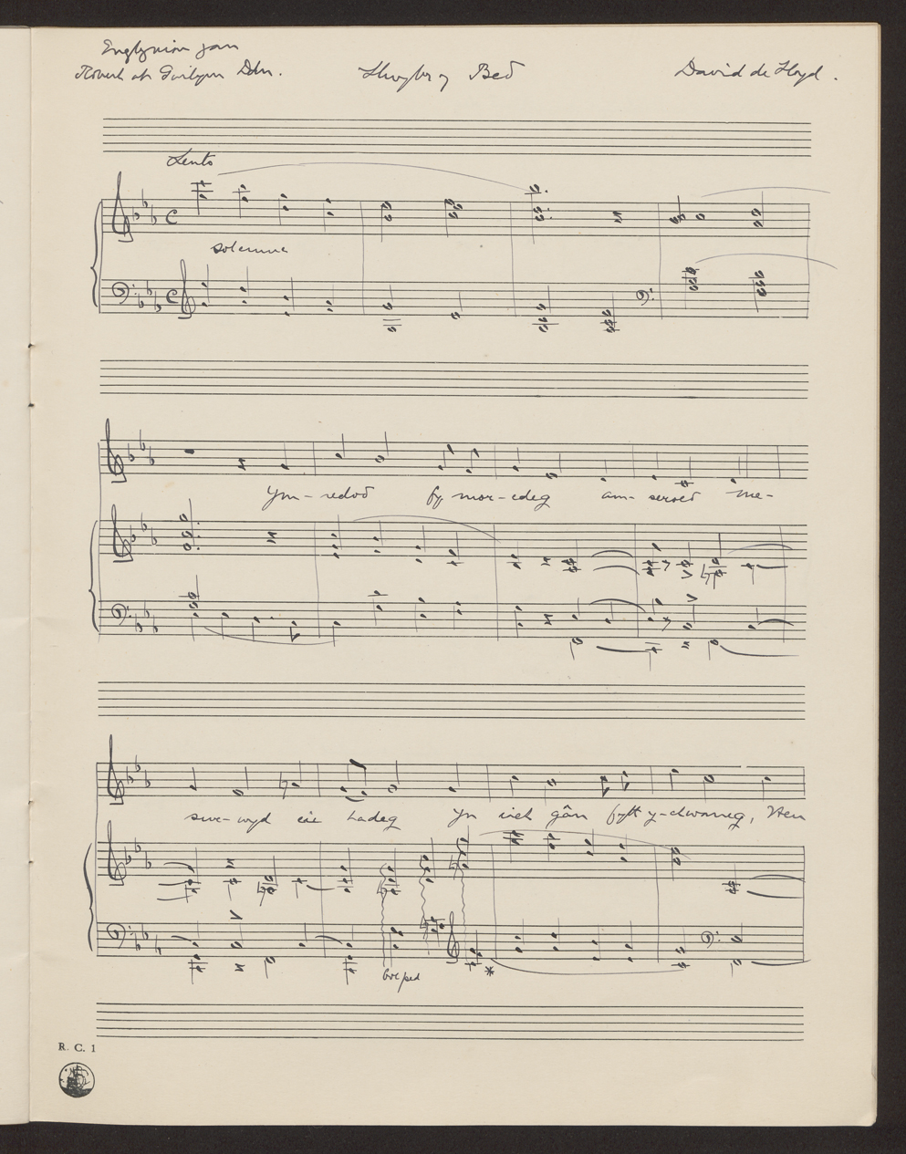 Although Welsh poetry boasts a long and distinguished tradition of the use of the strict metres of cynghanedd (a complex system of alliteration and internal rhymes), Welsh composers have been reluctant to set poetry in cynghanedd to music, because of the complexities and special requirements of the medium. David de Lloyd, like his older contemporary David Vaughan Thomas (1873–1934), felt that creating musical settings of poems in cynghanedd was the key to a national Welsh style in music, and he experimented particularly by setting englynion (four-line stanzas in cynghanedd), such as Englynion ar gân (1932), six englynion by T. Gwynn Jones, Dafydd Ddu Eryri and Robert ap Gwilym Ddu; Moes gusan (1935), a setting of englynion of unknown authorship; and Llys Ifor Hael (1943), a two-part setting of the familiar englynion by Ieuan Brydydd Hir which lament the ruined state of the court of a Welsh prince. De Lloyd may have viewed such attempts as a means of renewing the strong link that existed between Welsh poetry and music in the Middle Ages.