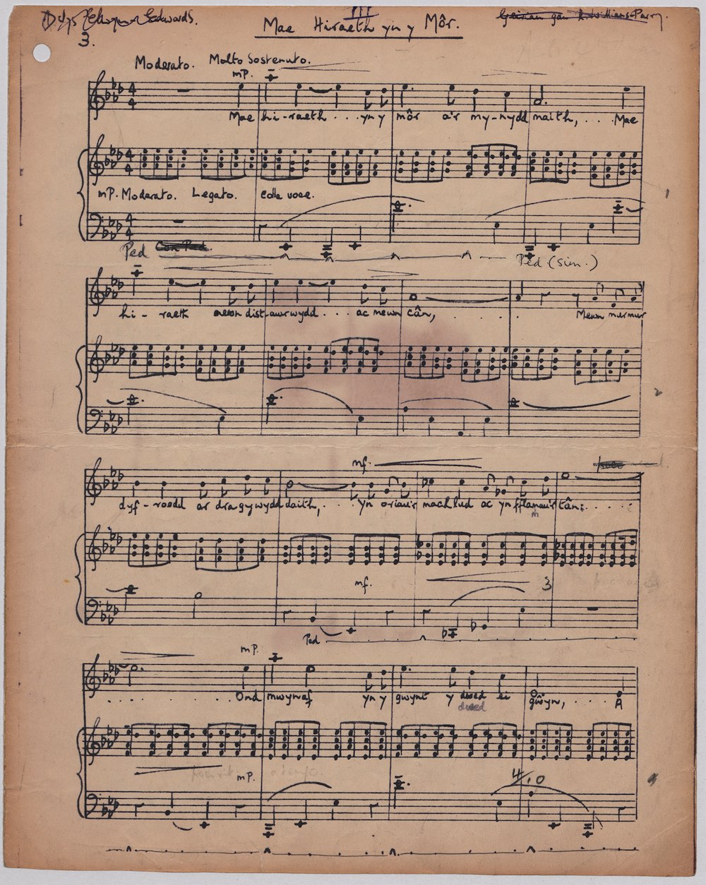 Comisiynwyd y casgliad hwn o dair cân gan y BBC yng Nghymru yn gynnar yn yr 1960au. Erbyn hynny roedd y gyfansoddwraig wedi ymgartrefu yng Nghaernarfon ac yn gweithio fel athrawes yn yr ysgol ramadeg leol. Roedd ei gŵr, David Elwyn Edwards, yn weinidog ar Eglwys Bresbyteraidd Y Maes (Castle Square) yn y dref a thrwy gydol bywyd creadigol Dilys bu Elwyn yn rhoi cyngor manwl iddi ar ddewis testun ar gyfer ei chyfansoddiadau. Ar gyfer y cylch hwn o ganeuon, penderfynwyd ar gerddi R. Williams Parry ac fe ddaeth y ddwy gân gyntaf i fod yn gymharol ddidrafferth. Eu cyfaill, y dramodydd Dr John Gwilym Jones, bwysodd ar Dilys i osod y soned enwog ‘Mae Hiraeth yn y Môr’ i gerddoriaeth, ond roedd hi’n gyndyn i wneud hynny ar y cychwyn, am yr union reswm mai soned oedd y gerdd. Hyd yn oed ar ôl cwblhau’r gwaith, teimlai’n ansicr – ond roedd hi’n benderfynol serch hynny y byddai’r gân yn agor gyda brawddeg oedd yn arwain i fyny at A-feddalnod uchel! Roedd y BBC yn amheus iawn o hyn ar y dechrau, felly ffoniodd y gyfansoddwraig ei ffrind William Mathias, oedd yn Ddarlithydd ym Mhrifysgol Bangor nid nepell i ffwrdd. Heb ymdroi, awgrymodd yntau’r tenor Kenneth Bowen: “Mae gan Ken A feddalnod uchaf ardderchog”, meddai – ac felly aethpwyd ymlaen yn ddigyfnewid gydag un o’r agoriadau mwyaf cofiadwy i unrhyw gân Gymraeg. Enillodd y gân ei lle yn fuan iawn fel ffefryn mewn cyngherddau a chystadlaethau ar gyfer lleisiau tenor a soprano fel ei gilydd, a bellach mae hon yn un o glasuron y repertoire.