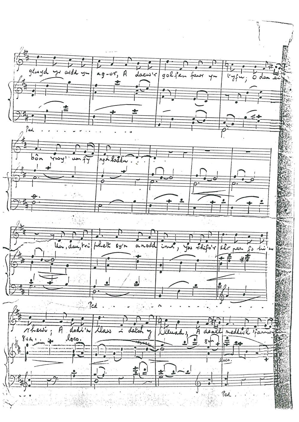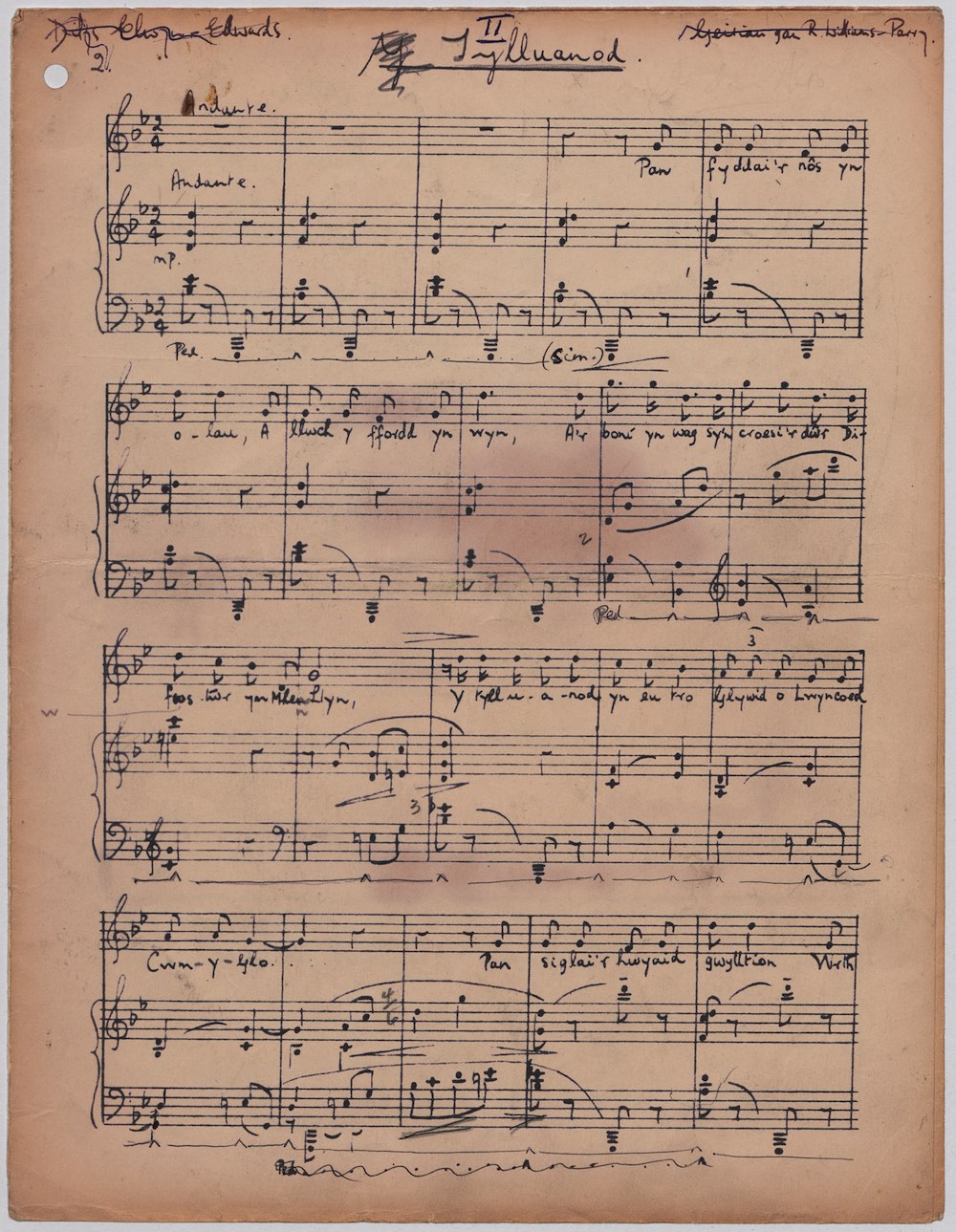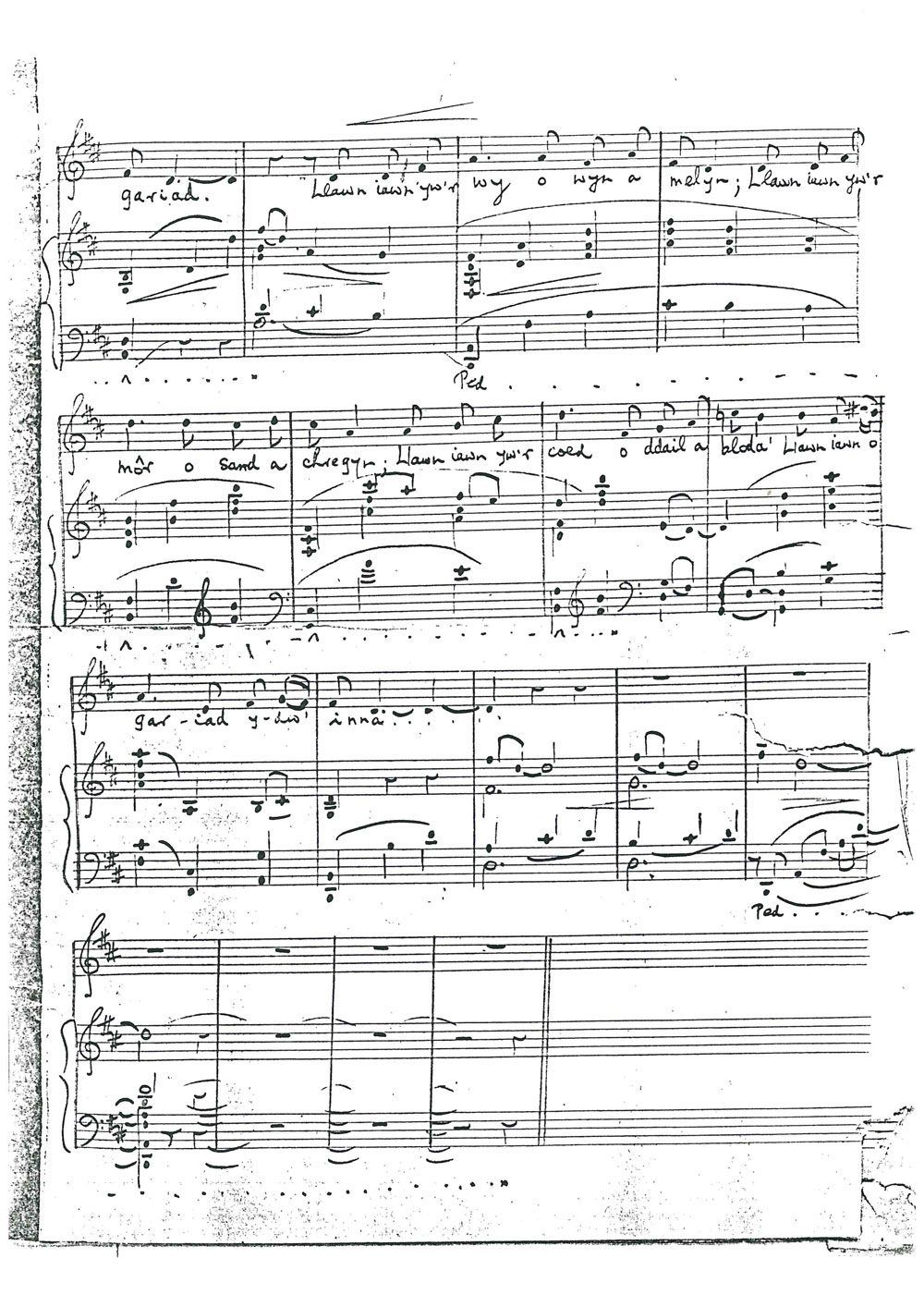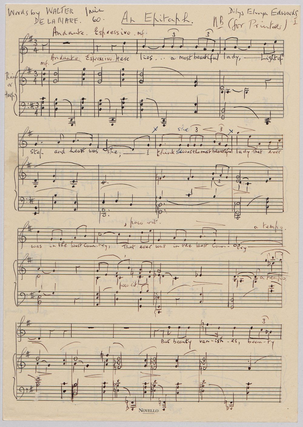 Walter de la Mare, yn ddi-os, oedd un o hoff feirdd Dilys Elwyn-Edwards – serch a daniwyd gan ei hoffter cychwynnol o gân ddigyffelyb Herbert Howells, King David, a threfniannau eraill o’i gerddi allan o’r gyfrol Peacock Pie. Yn ystod ei chyfnod yn astudio gyda Howells ym mlynyddoedd cynnar yr 1950au, byddai Howells yn aml yn ei hannog i osod cerddi gan rai o’i hoff awduron ef ei hun; un enghraifft nodedig o hyn oedd y rhan-gân hyfryd, All that’s Past, a gyhoeddwyd wedi hynny gan Novello a’i chynnwys fel atodiad yn y Musical Times. Ar ôl dychwelyd i Gymru ym mlynyddoedd olaf yr 1950au, roedd yn anorfod, yn ôl pob tebyg, mai gosod cerddi Cymraeg (yn hytrach na rhai Saesneg) wnâi Dilys, oherwydd arferai ymateb yn hynod naturiol i geisiadau neu gomisiynau am gerddoriaeth, a heb ysgogiad o’r fath cymharol brin yw’r hyn a gyfansoddwyd ganddi. Felly, yn 2001, pan dderbyniodd gomisiwn i gyfansoddi rhai caneuon ar gyfer Gŵyl Cricieth, i’w canu gan y soprano Rosamund Shelley, trodd Dilys, yn gwbl nodweddiadol, at de la Mare am y ddwy gân gaboledig a myfyriol hyn. Yn dilyn ei marwolaeth serch hynny, profiad dadlennol i fi – fel ei hysgutor cerddorol – oedd darganfod ei bod mewn gwirionedd wedi gosod An Epitaph nifer o flynyddoedd cyn hynny, heb fod ganddi unrhyw berfformiad mewn golwg, ond yn unig ar gyfer ei difyrrwch personol. Adeg y cyngerdd yng Nghricieth, ni soniodd ddim am hyn ac roedd yn brofiad teimladwy i ganfod – wrth edrych yn ôl – bod y gosodiad diweddarach yn amlwg wahanol o ran tôn. Myfyrdod ar ddiflaniad amser a phyliad harddwch, rywsut, oedd y gân berffaith fyddai’n gweithredu’n ddiarwybod fel cân ffarwel ynddi’i hun.