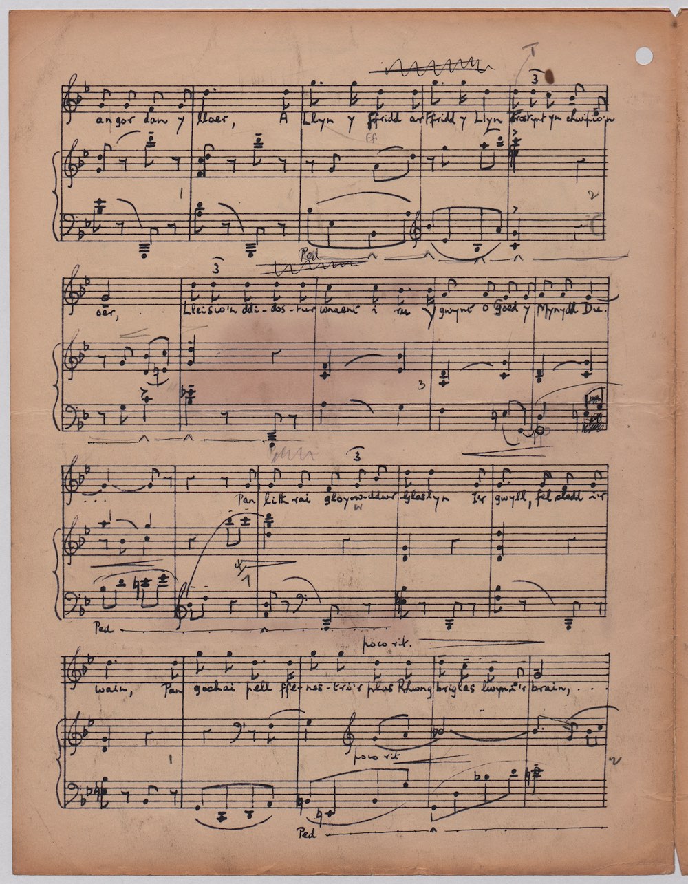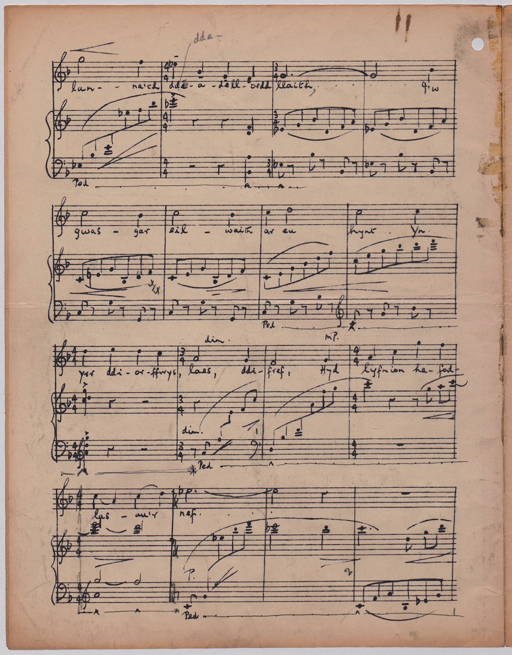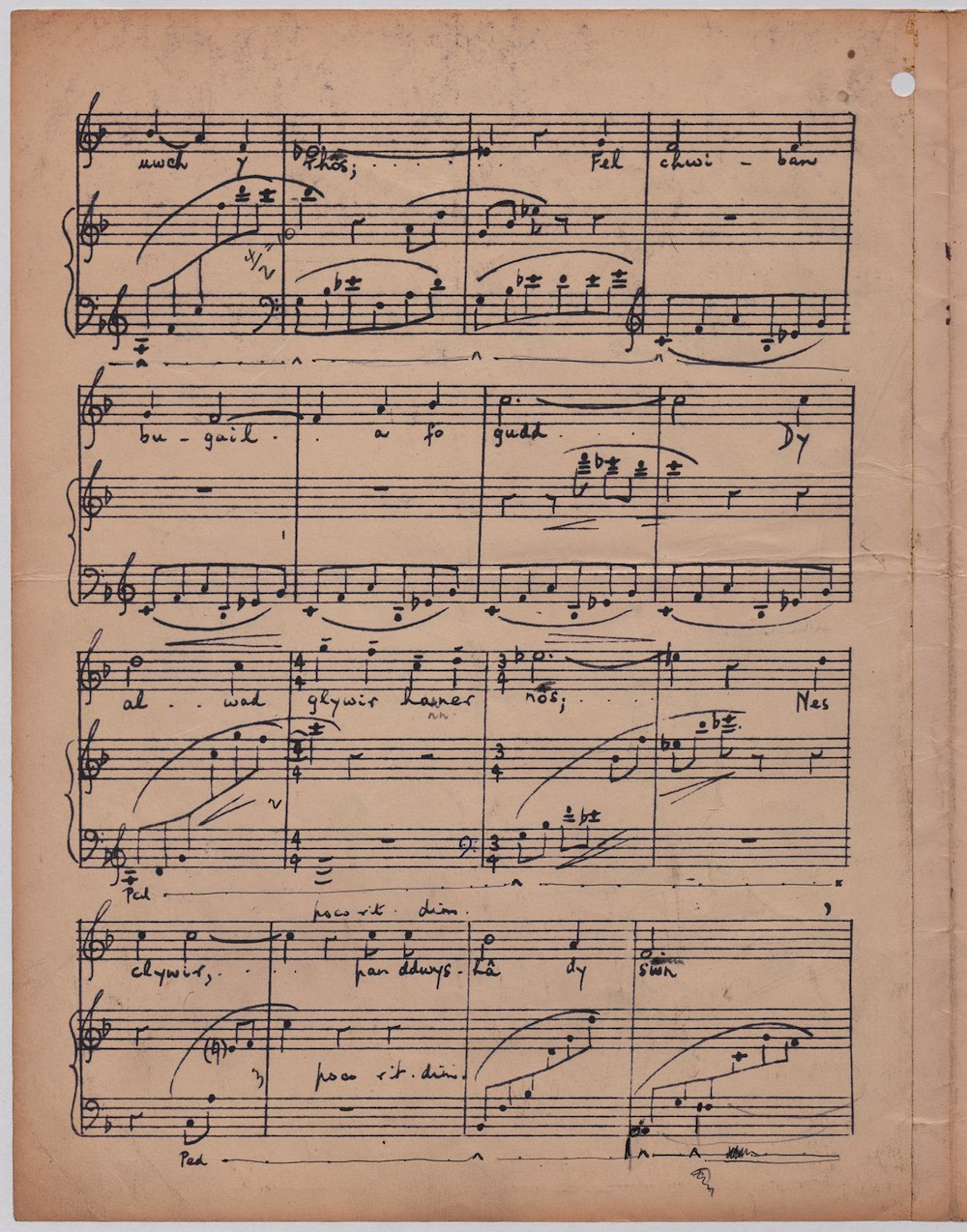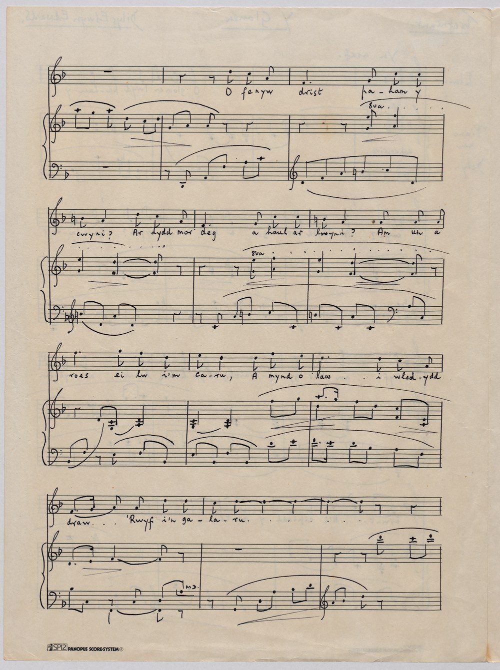 Walter de la Mare, yn ddi-os, oedd un o hoff feirdd Dilys Elwyn-Edwards – serch a daniwyd gan ei hoffter cychwynnol o gân ddigyffelyb Herbert Howells, King David, a threfniannau eraill o’i gerddi allan o’r gyfrol Peacock Pie. Yn ystod ei chyfnod yn astudio gyda Howells ym mlynyddoedd cynnar yr 1950au, byddai Howells yn aml yn ei hannog i osod cerddi gan rai o’i hoff awduron ef ei hun; un enghraifft nodedig o hyn oedd y rhan-gân hyfryd, All that’s Past, a gyhoeddwyd wedi hynny gan Novello a’i chynnwys fel atodiad yn y Musical Times. Ar ôl dychwelyd i Gymru ym mlynyddoedd olaf yr 1950au, roedd yn anorfod, yn ôl pob tebyg, mai gosod cerddi Cymraeg (yn hytrach na rhai Saesneg) wnâi Dilys, oherwydd arferai ymateb yn hynod naturiol i geisiadau neu gomisiynau am gerddoriaeth, a heb ysgogiad o’r fath cymharol brin yw’r hyn a gyfansoddwyd ganddi. Felly, yn 2001, pan dderbyniodd gomisiwn i gyfansoddi rhai caneuon ar gyfer Gŵyl Cricieth, i’w canu gan y soprano Rosamund Shelley, trodd Dilys, yn gwbl nodweddiadol, at de la Mare am y ddwy gân gaboledig a myfyriol hyn. Yn dilyn ei marwolaeth serch hynny, profiad dadlennol i fi – fel ei hysgutor cerddorol – oedd darganfod ei bod mewn gwirionedd wedi gosod An Epitaph nifer o flynyddoedd cyn hynny, heb fod ganddi unrhyw berfformiad mewn golwg, ond yn unig ar gyfer ei difyrrwch personol. Adeg y cyngerdd yng Nghricieth, ni soniodd ddim am hyn ac roedd yn brofiad teimladwy i ganfod – wrth edrych yn ôl – bod y gosodiad diweddarach yn amlwg wahanol o ran tôn. Myfyrdod ar ddiflaniad amser a phyliad harddwch, rywsut, oedd y gân berffaith fyddai’n gweithredu’n ddiarwybod fel cân ffarwel ynddi’i hun.