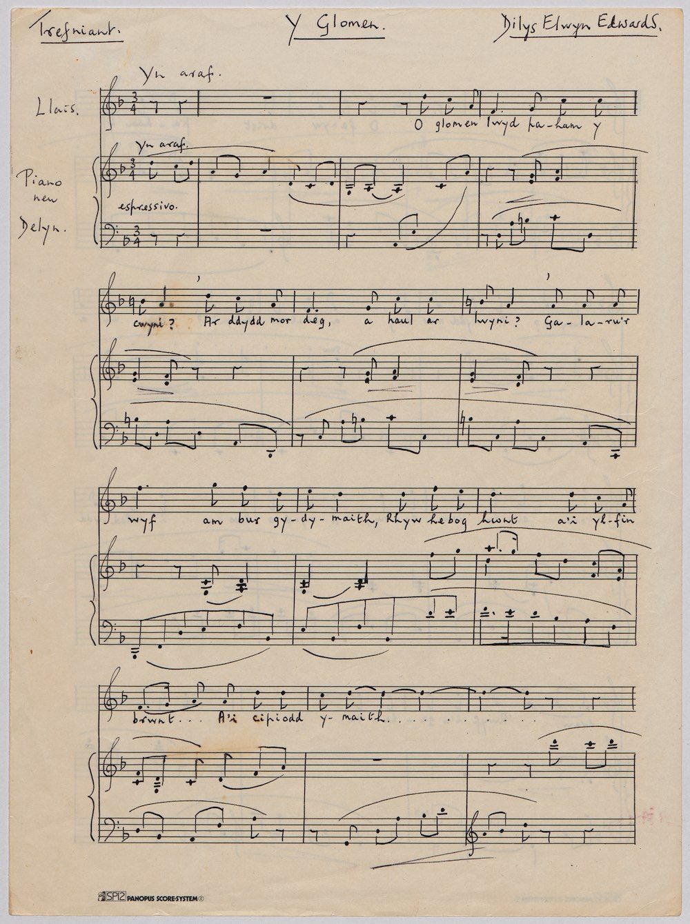 Dau drefniant o blith nifer o drefniannau o alawon gwerin na chawsant eu cyhoeddi yw ‘Y Glomen’ a ‘Y Deryn Du’ ac mae’r caneuon hyn yn dwyn i gof y ffaith bod gan Dilys ei hun lais canu dymunol. Byddai’n aml yn creu brasluniau o gyfeiliannau, er difyrrwch iddi hi ei hun yn ogystal ag ar gyfer cyngherddau a darllediadau, pan fyddai hi ei hun yn aml yn ymddangos fel cyfeilyddes benigamp i’r cantorion.