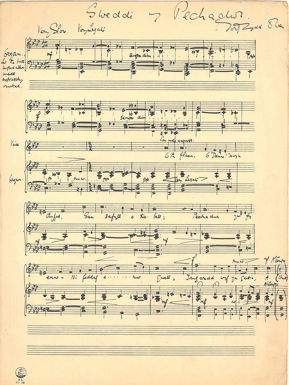 Widely regarded as her ‘masterpiece’, the song Gweddi y Pechadur (The Sinner’s Prayer) was composed in London in June 1913. The manuscript designates it as a ‘Sacred Song’ with organ accompaniment. It sets words by Thomas Williams (1761-1844), an independent minister and hymn writer who formed the Bethesda Chapel in Llantwit Major in 1806. The words concern a penitent and guilt-ridden sinner pleading with God for forgiveness. The work was first published by Snell in 1922.