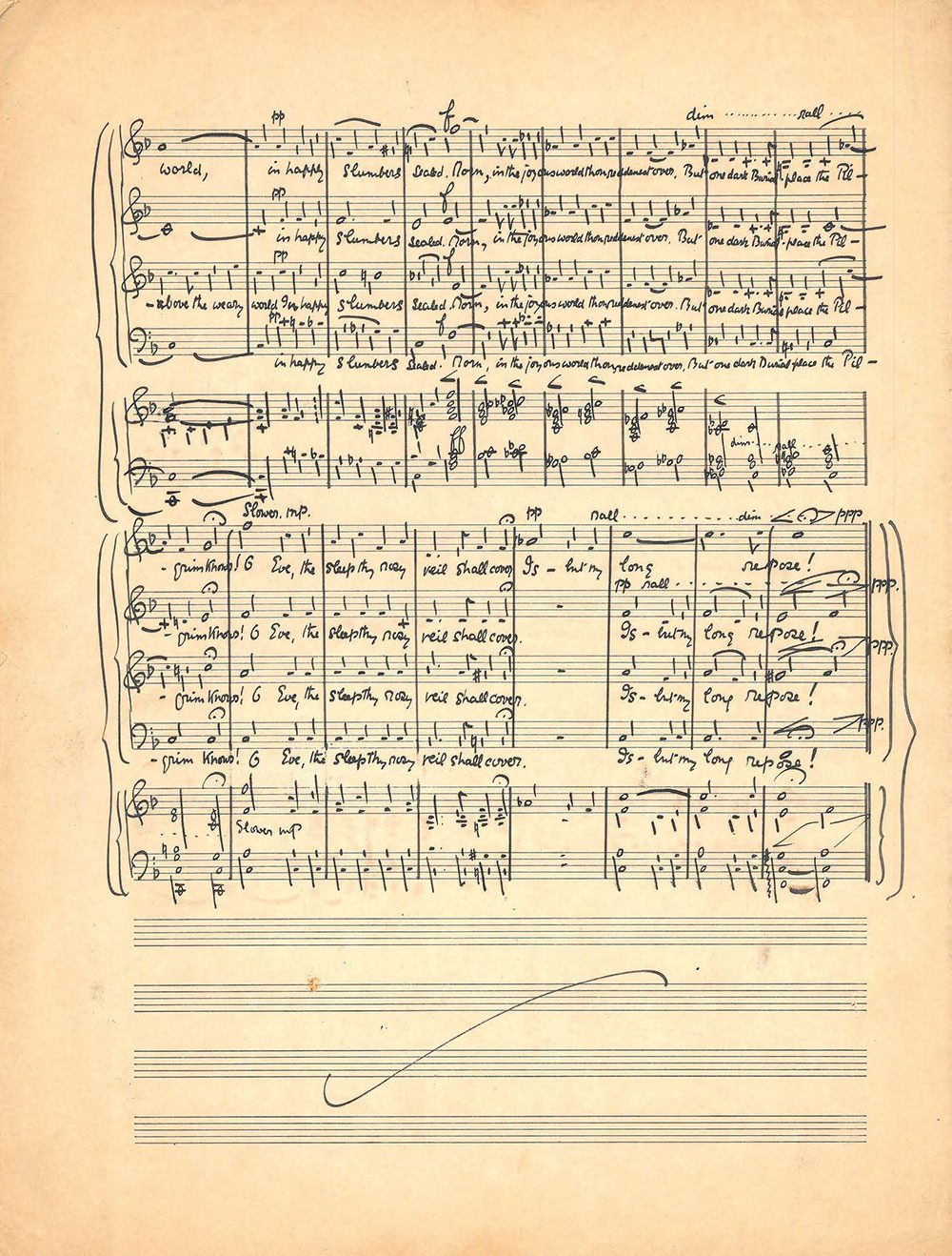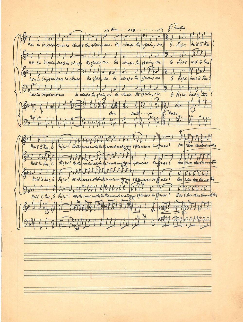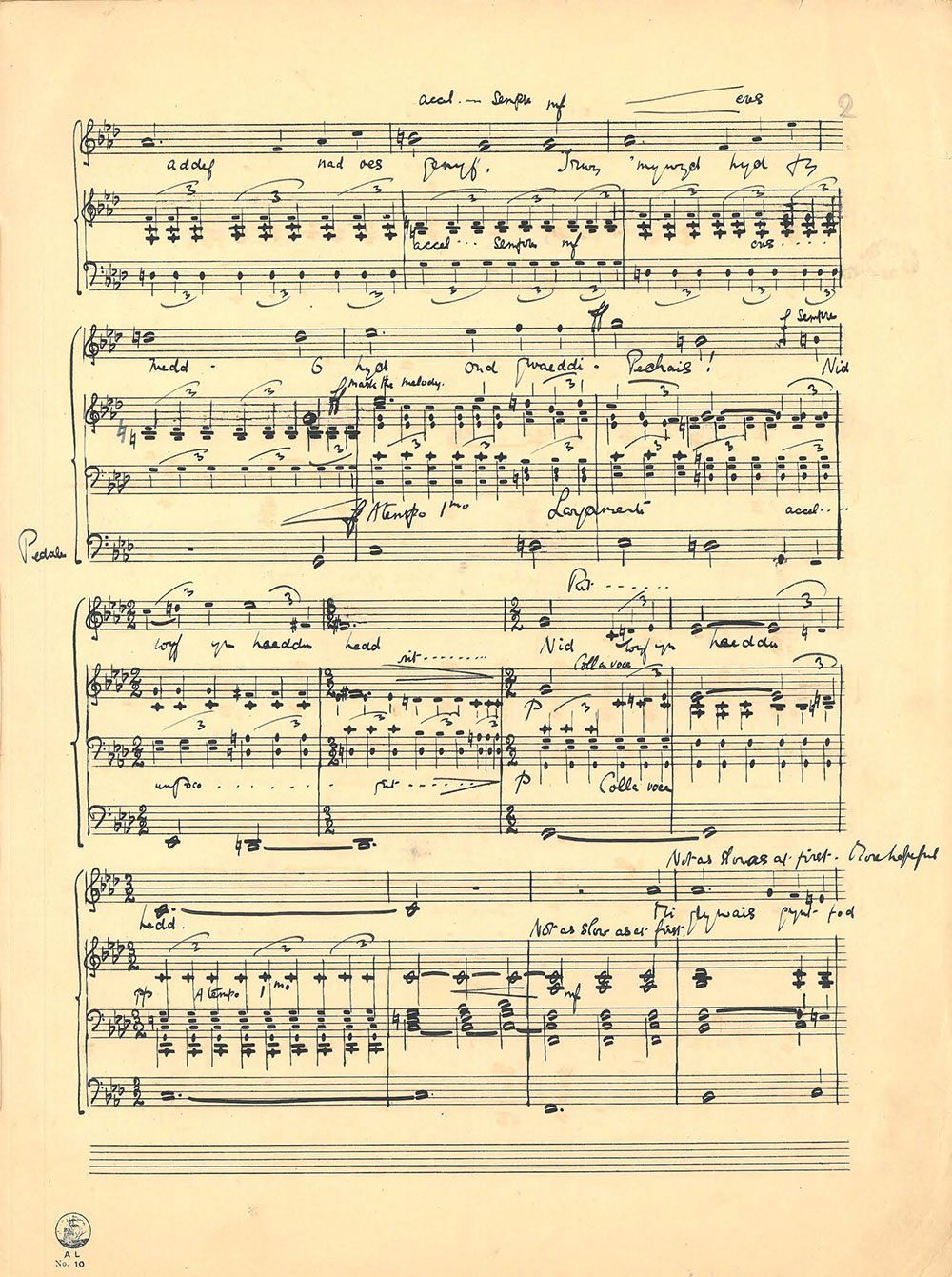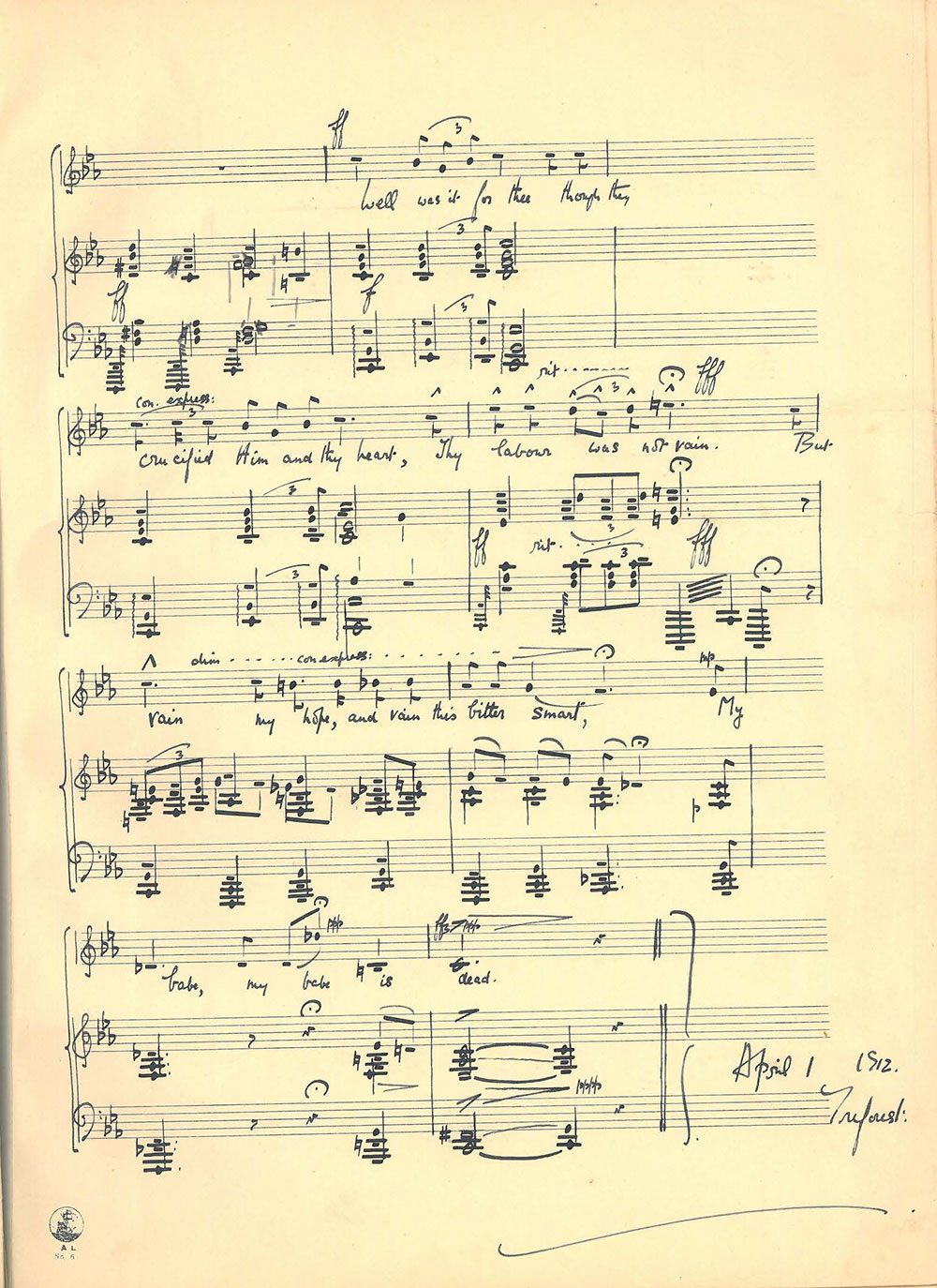 This short choral work for mixed choir and piano was completed in 1911, presumably towards the end of Morfydd Owen’s period as a student at the University College of South Wales and Monmouthshire. It is a setting of words by Friedrich Schiller in Edward Bulwer Lytton’s translation. It is one of her least-known works, not listed in the published studies of her work and is still essentially a student work, albeit much more sophisticated than the earlier sonata. It falls into three sections: an initial moderato; a middle section in 6/8 and a slow closing section (Lento).