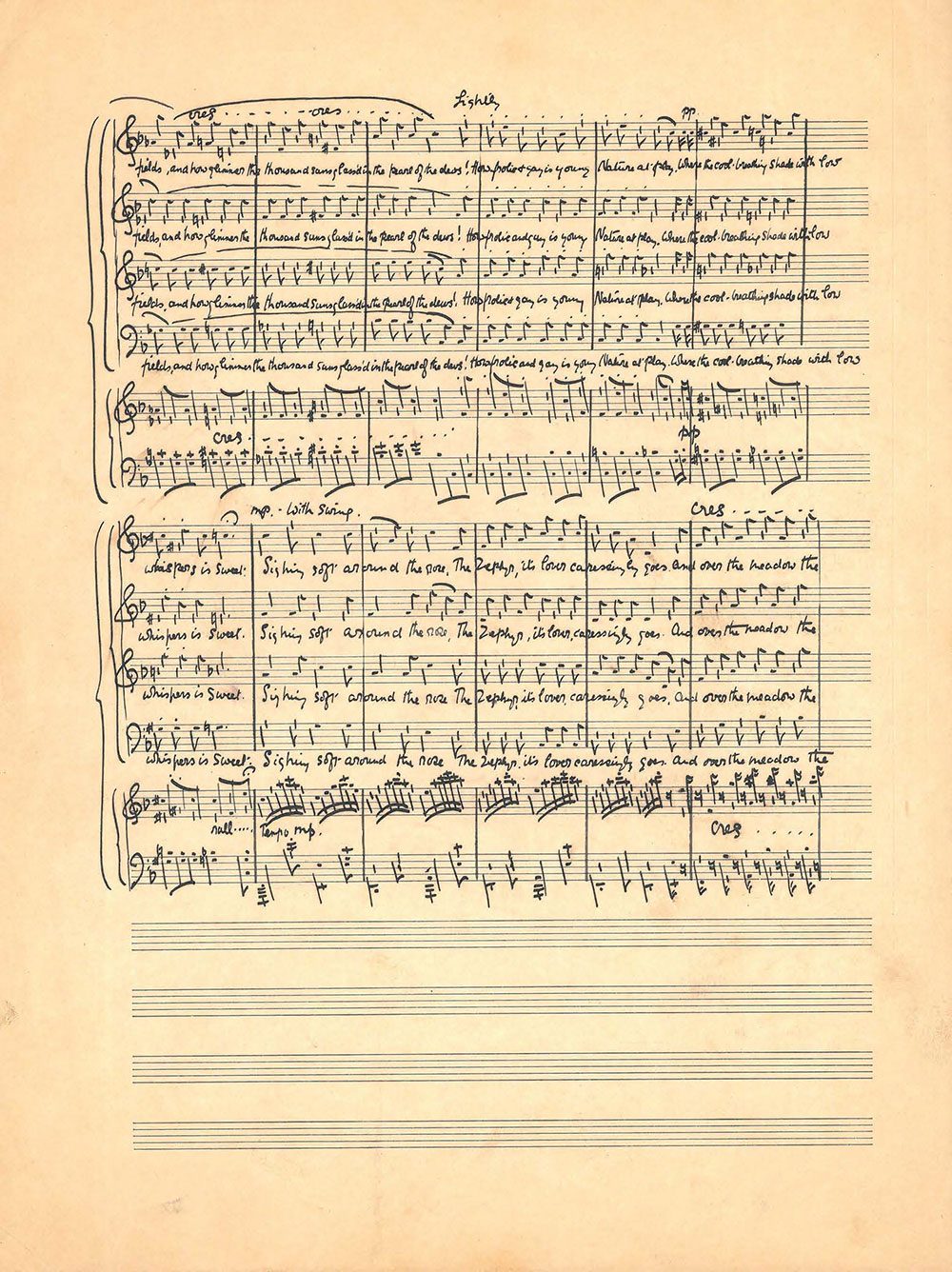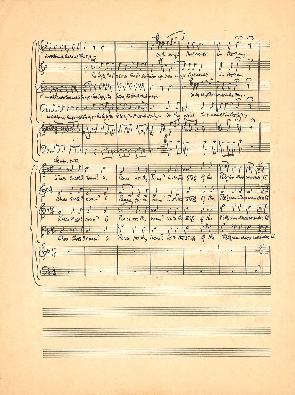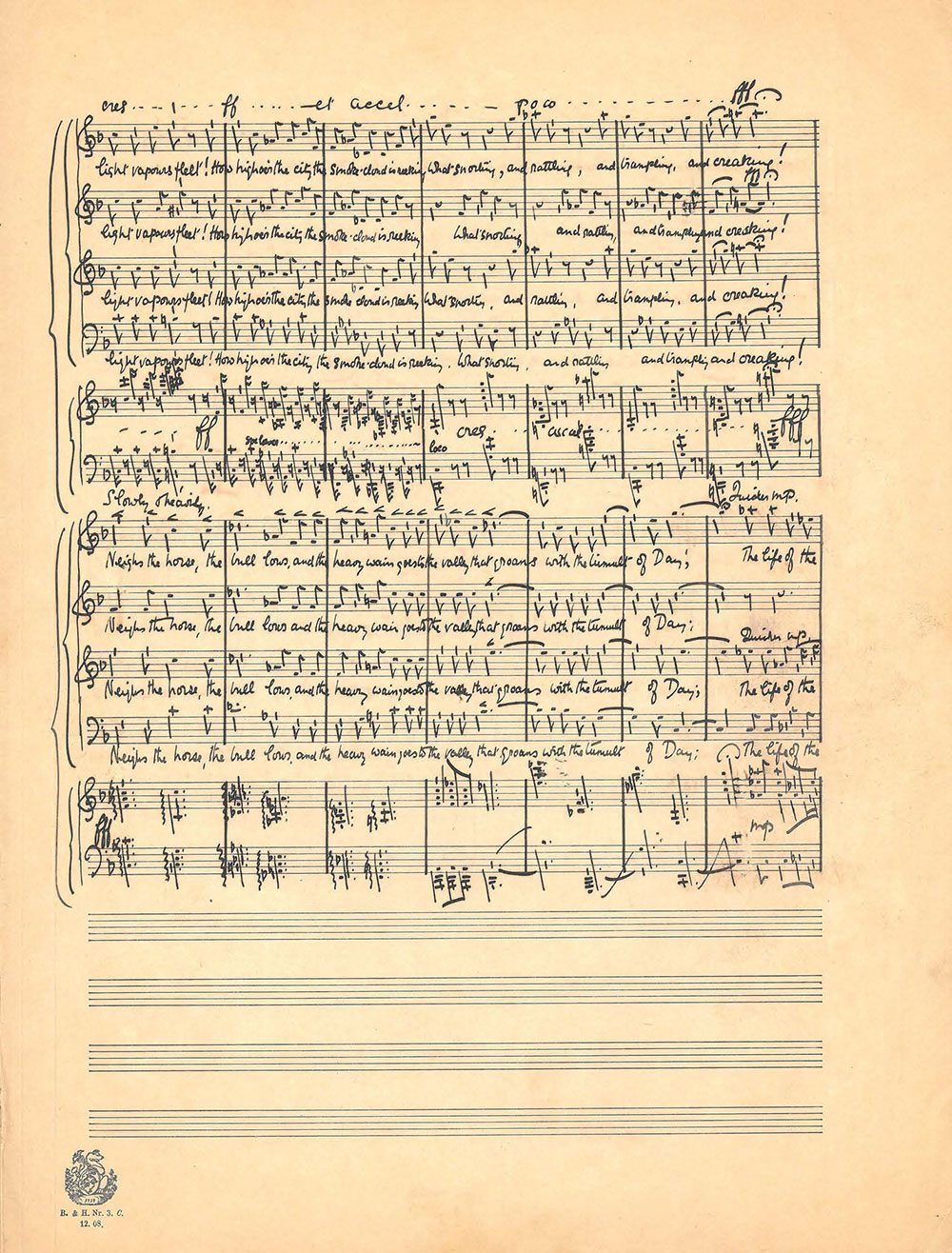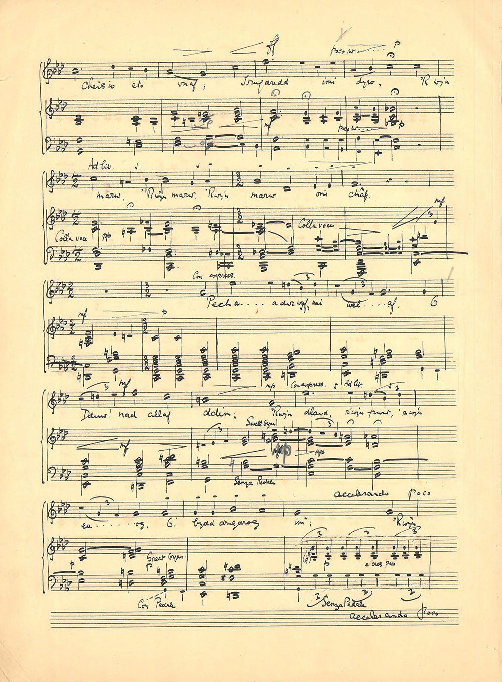 This short choral work for mixed choir and piano was completed in 1911, presumably towards the end of Morfydd Owen’s period as a student at the University College of South Wales and Monmouthshire. It is a setting of words by Friedrich Schiller in Edward Bulwer Lytton’s translation. It is one of her least-known works, not listed in the published studies of her work and is still essentially a student work, albeit much more sophisticated than the earlier sonata. It falls into three sections: an initial moderato; a middle section in 6/8 and a slow closing section (Lento).