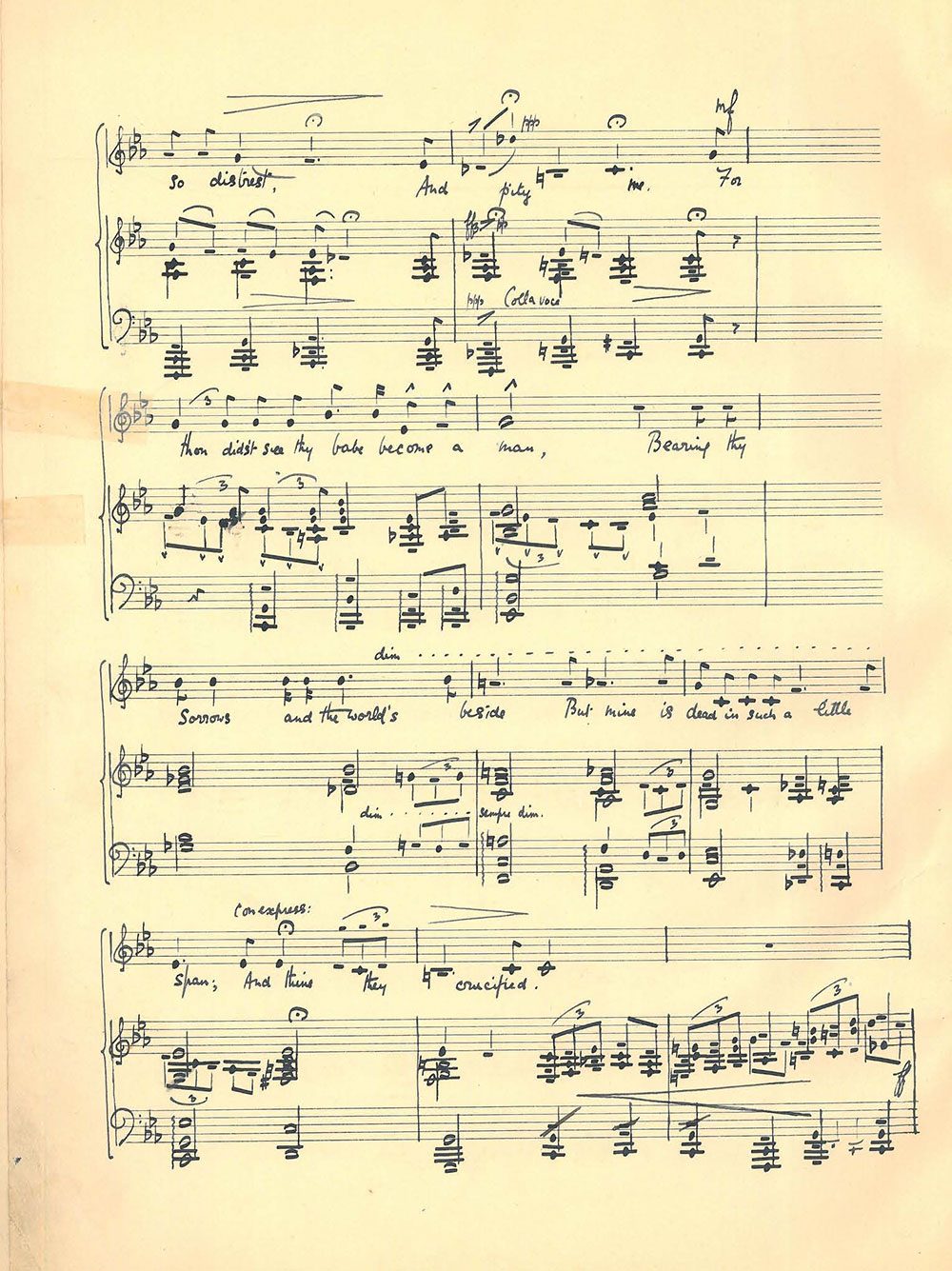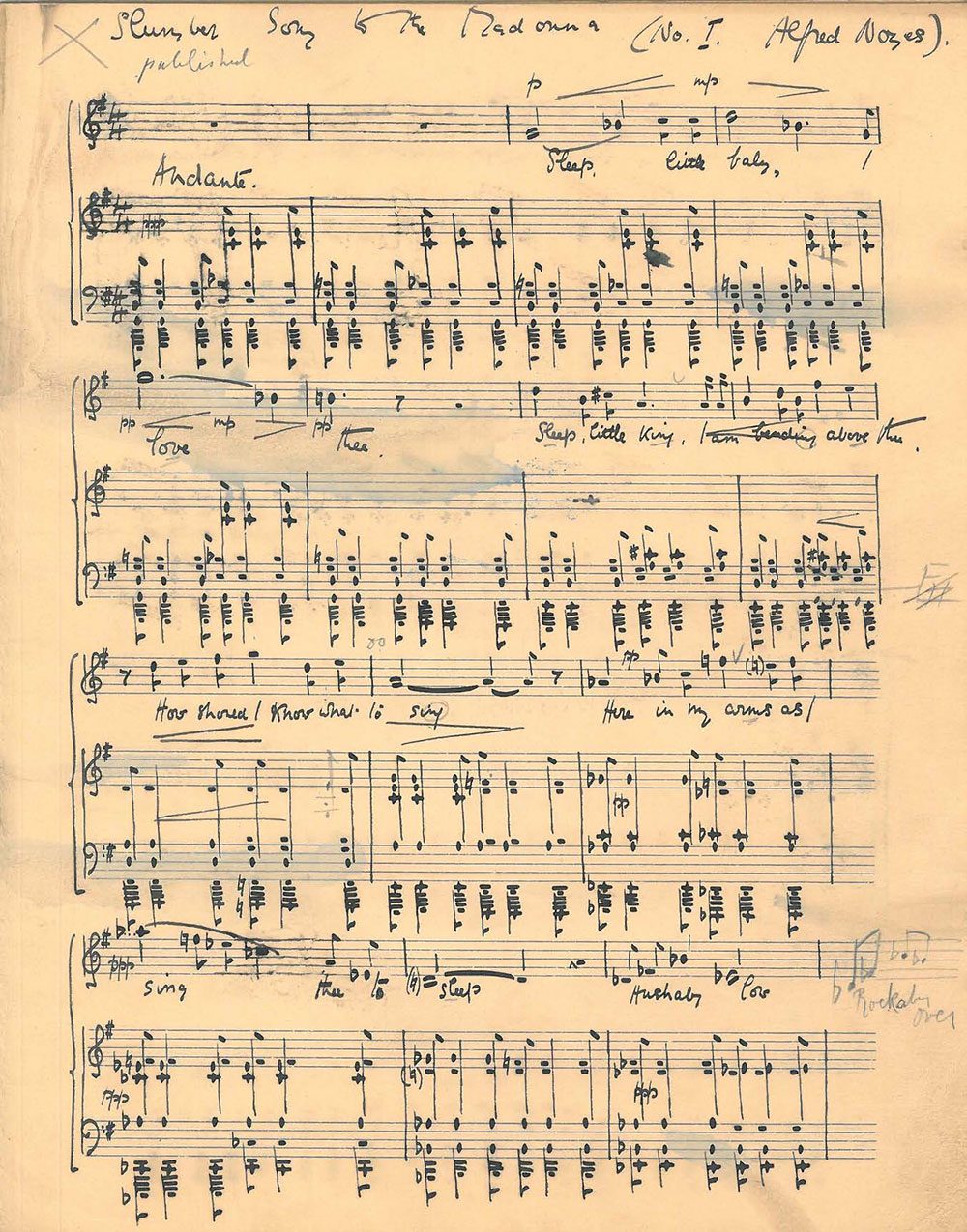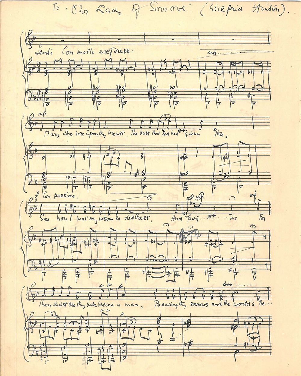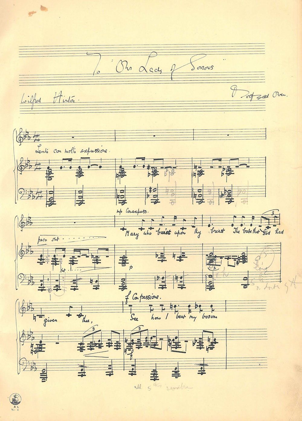 With these two songs, written in 1912 and 1913 respectively, Morfydd Owen made a leap from the earlier student works to her more mature voice. They date from April 1912 (during her last year at the University College of South Wales and Monmouthshire) and April 1913, by which time she had entered the Royal Academy of Music. Significantly, the first was composed in Treforest and the second in her rooms at Maida Vale, London. The words are by Wilfred Hinton (1887-1949) and Alfred Noyes (1880-1958) respectively. Hinton pursued a career as an economist, but was educated at Howard Gardens School in Cardiff. Following her death, Ernest Jones and Frederick Corder arranged for the publication of a four-volume memorial edition of her work for voice and piano and for piano solo (Anglo-French Music Company Ltd, London 1924) in which these two songs appeared. The two manuscripts here of To Our Lady of Sorrows appear in two different keys, C minor and D minor, though they both carry the same date of composition.